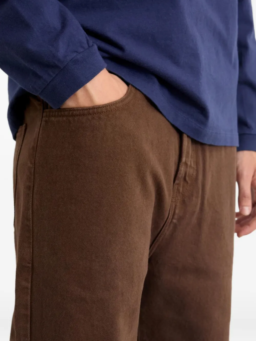 Шоколадного цвета, с задним накладным карманом, шлевками для ремня, пятью карманами