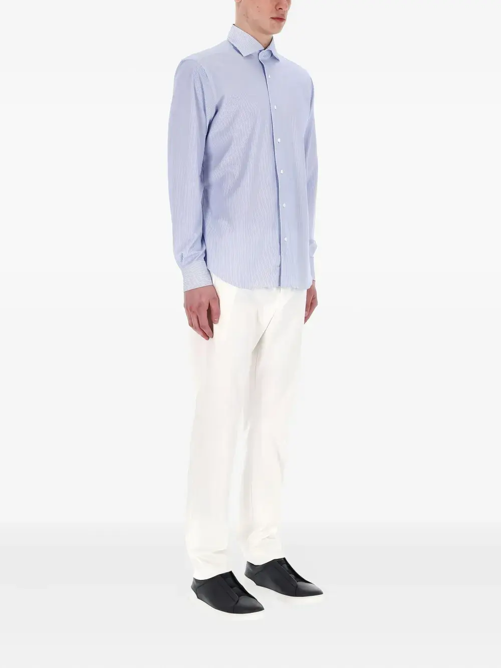 Светло-голубая в полоску, длинные рукава, застежка на пуговицы, манжеты на пуговицах