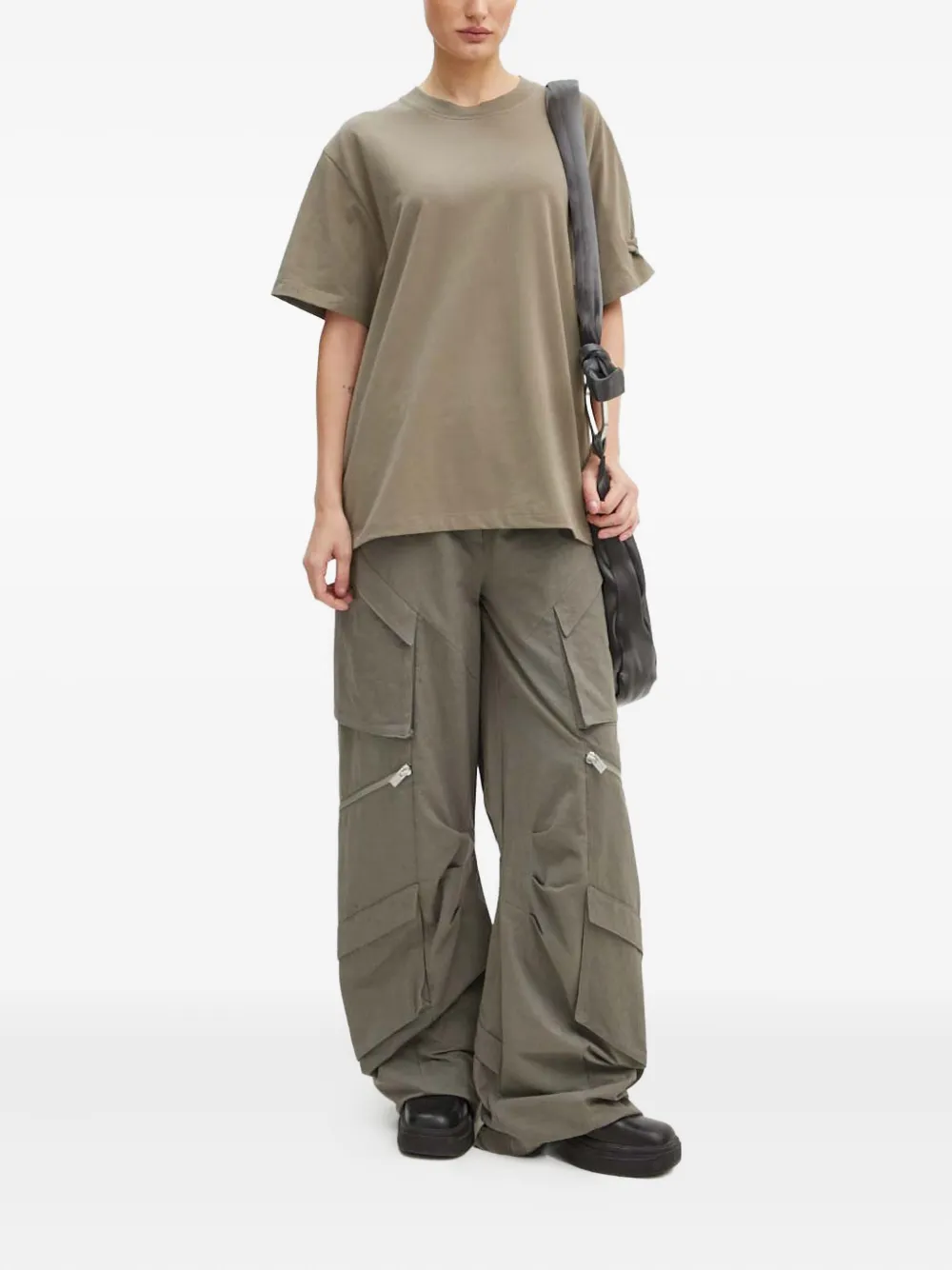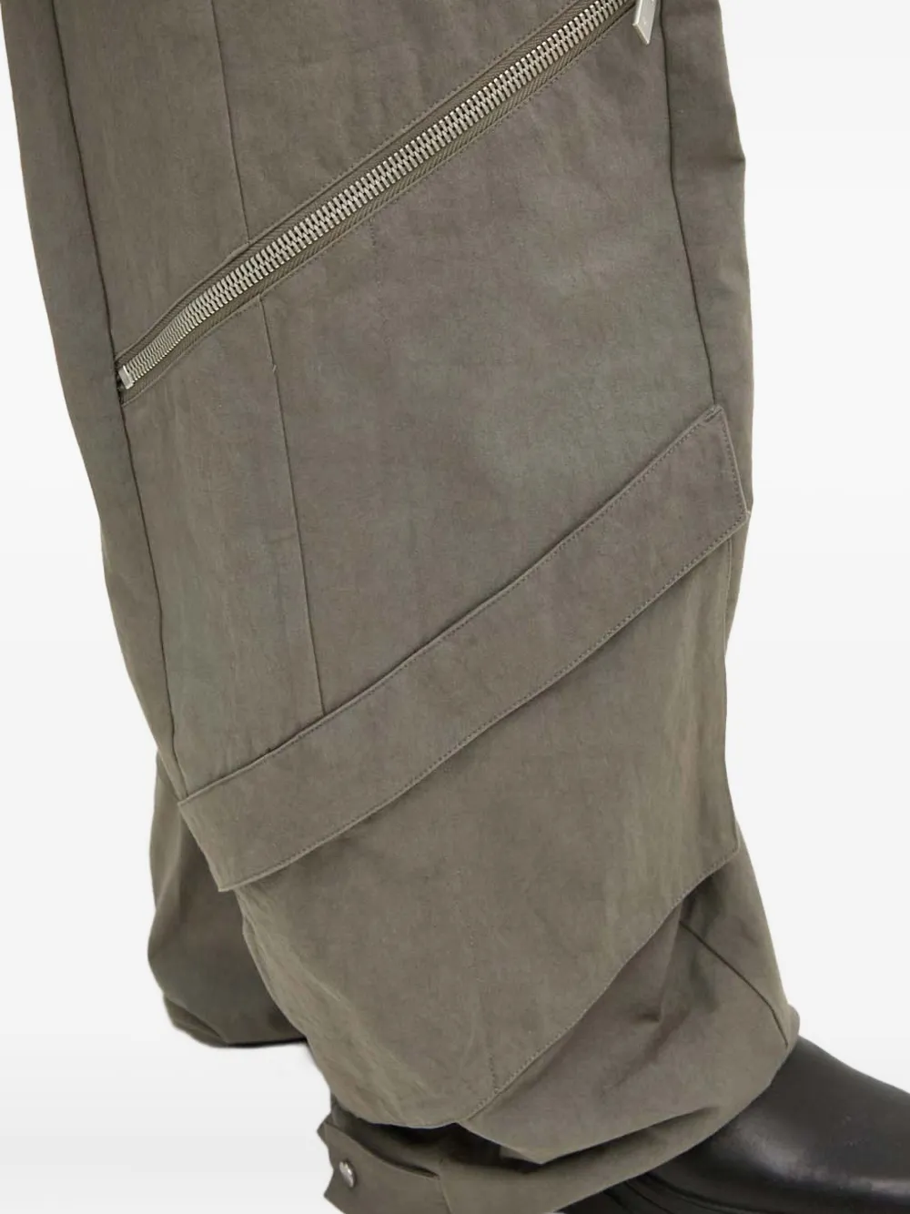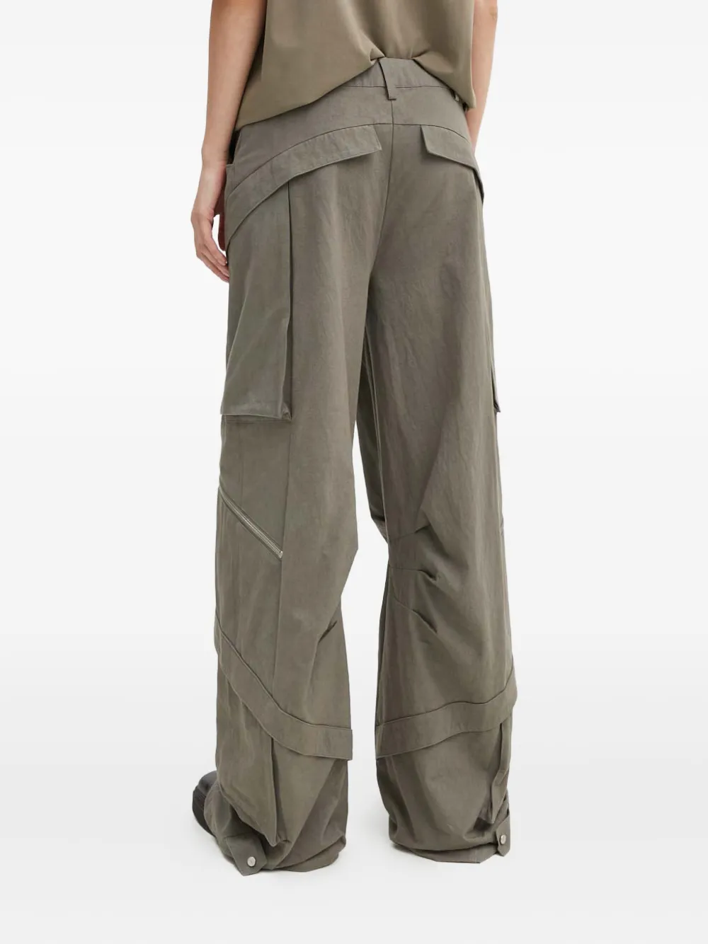 Серый цвет, множество карманов, детали с молниями, шлевки для ремня, скрытая застежка