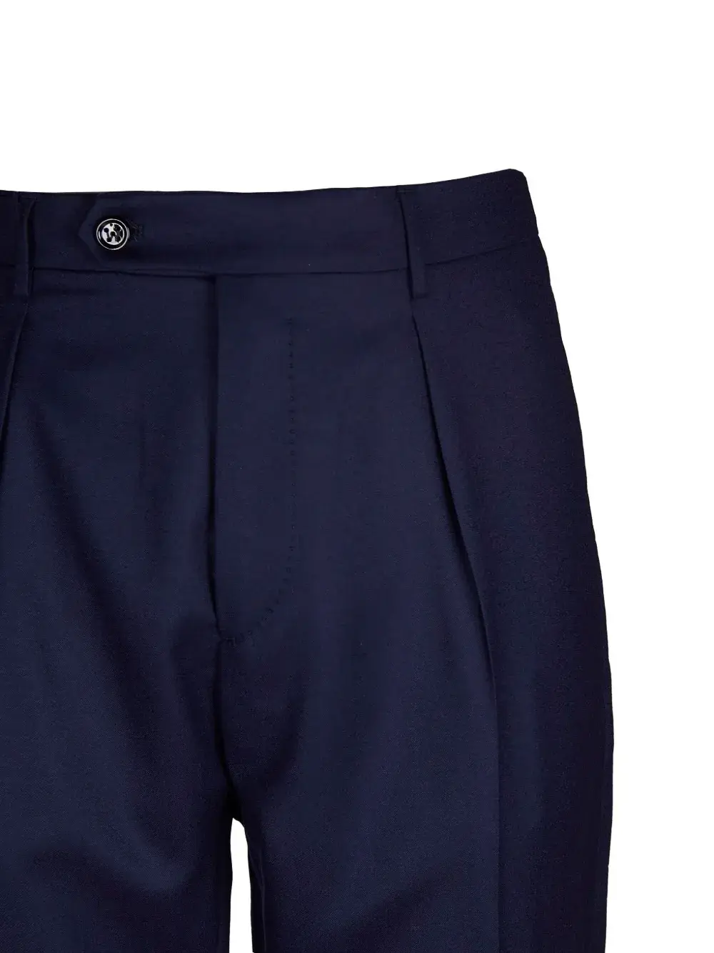 Темно-синие, застежка на пуговицы, шлевки для ремня, подвернутый край, защипы спереди