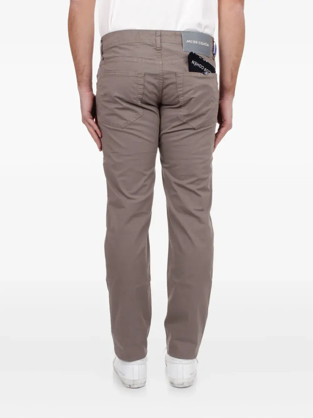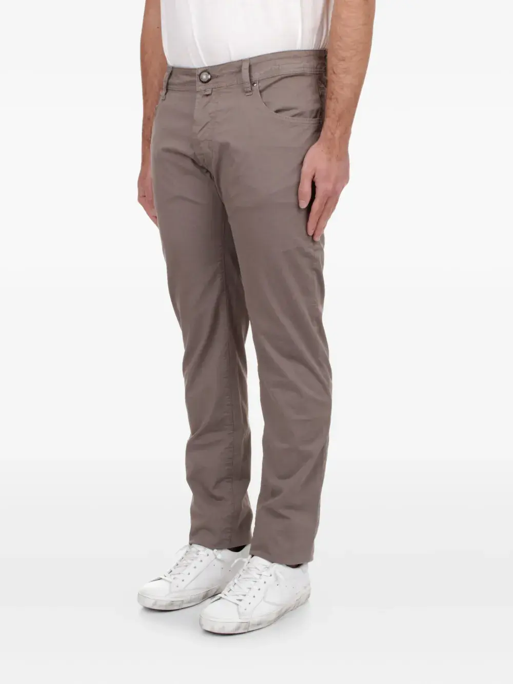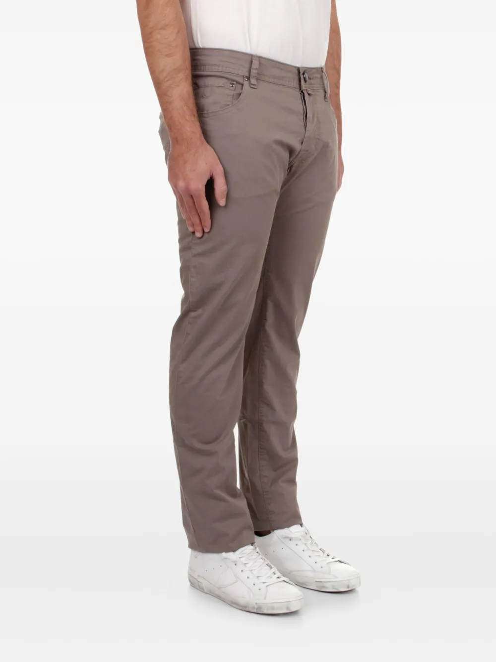 Слоново-серый, шлевки для ремня, застежка на пуговицу, пять карманов, однотонная строчка