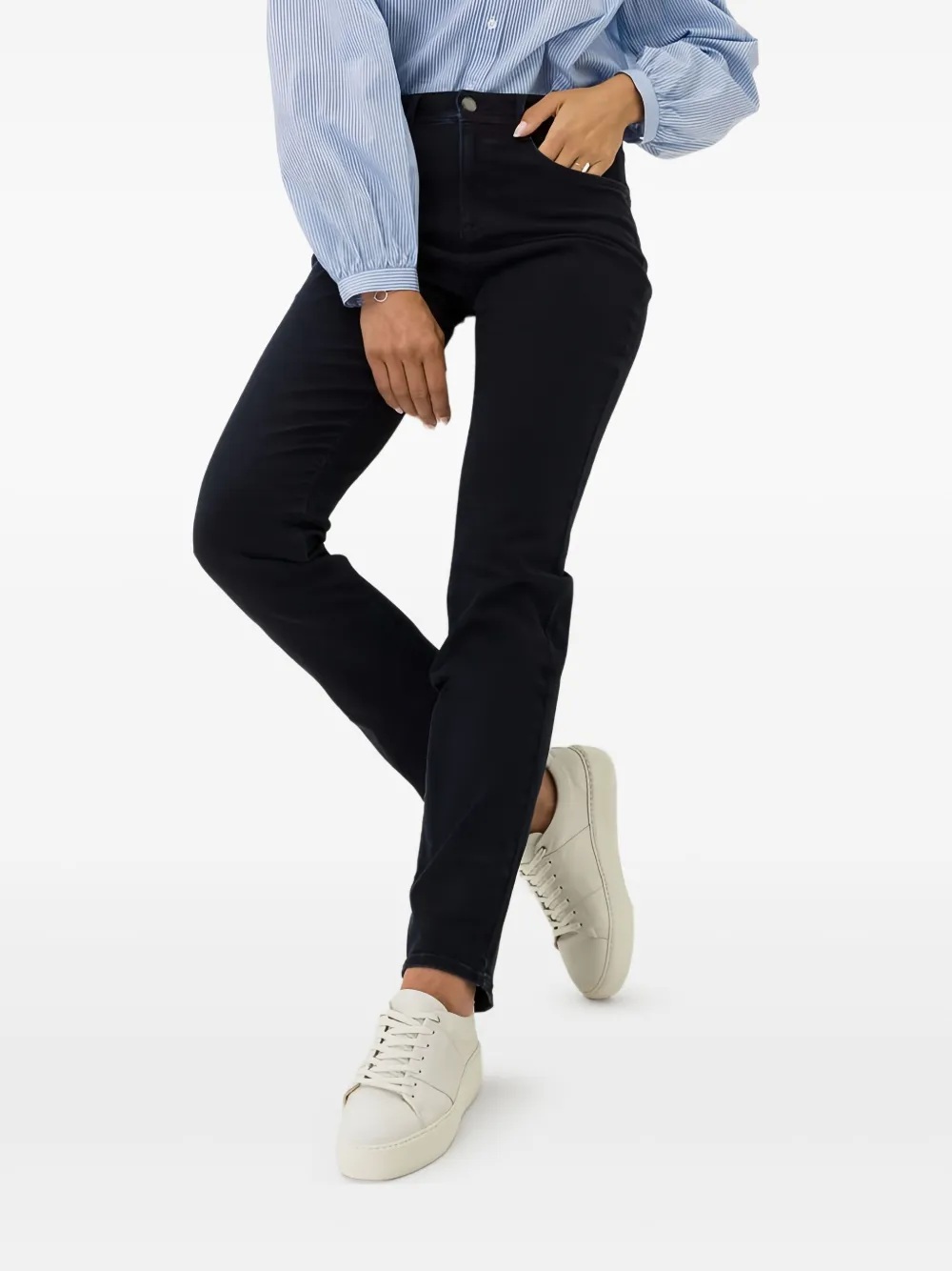 Темно-синий, тональная прострочка, шлевки для ремня, пять карманов, застежка на пуговицу