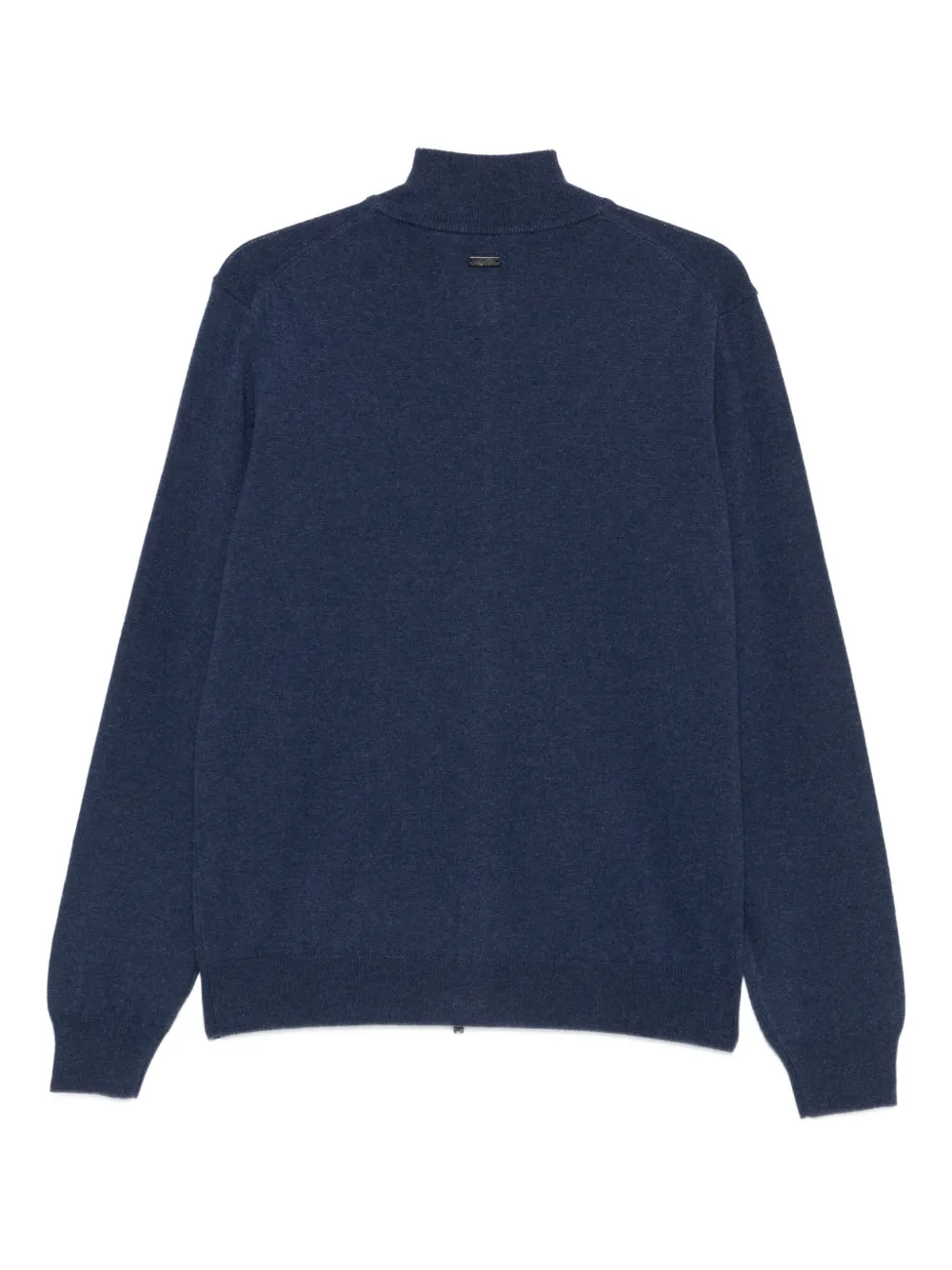 Синий цвет, застежка-молния, высокий воротник, ребристый низ, ребристые манжеты, прямой край