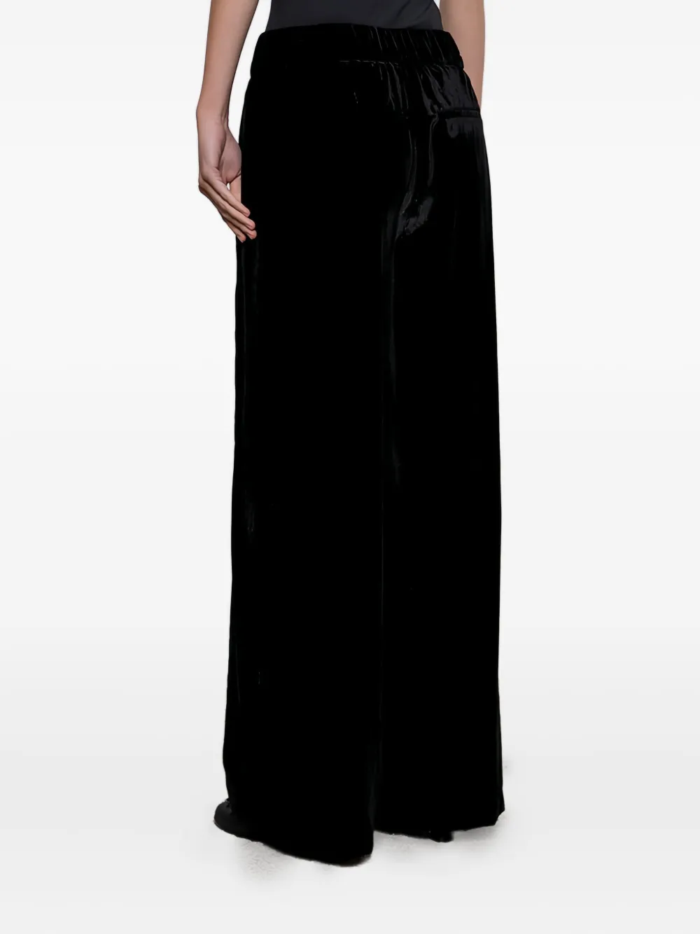 Черная бархатная текстура, эластичный пояс, прямые штанины, без застежки, однотонная строчка