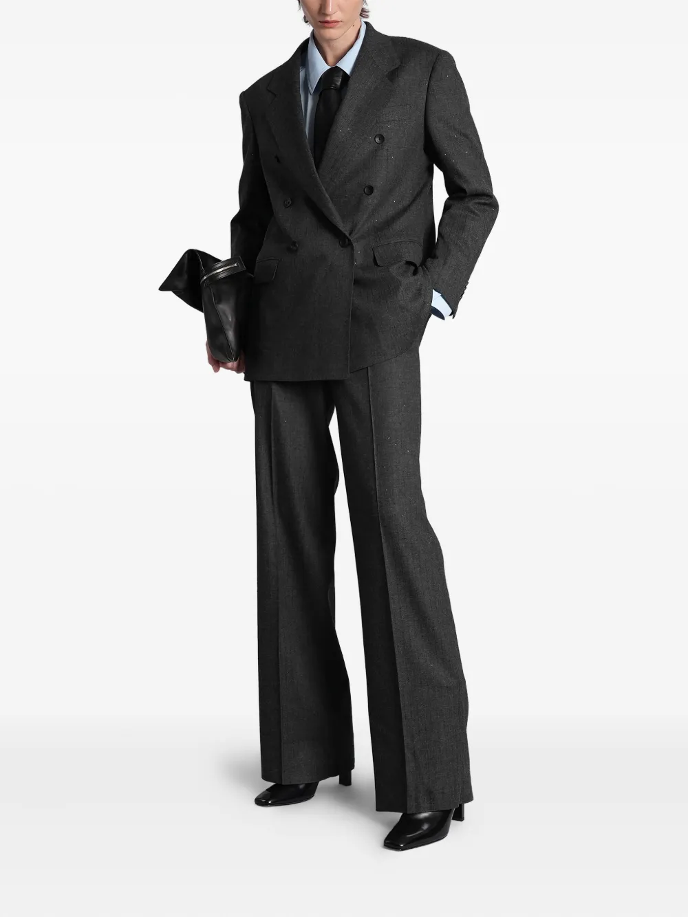 Серый цвет, елочный узор, боковые карманы в швах, шлевки для ремня, скрытая застежка спереди