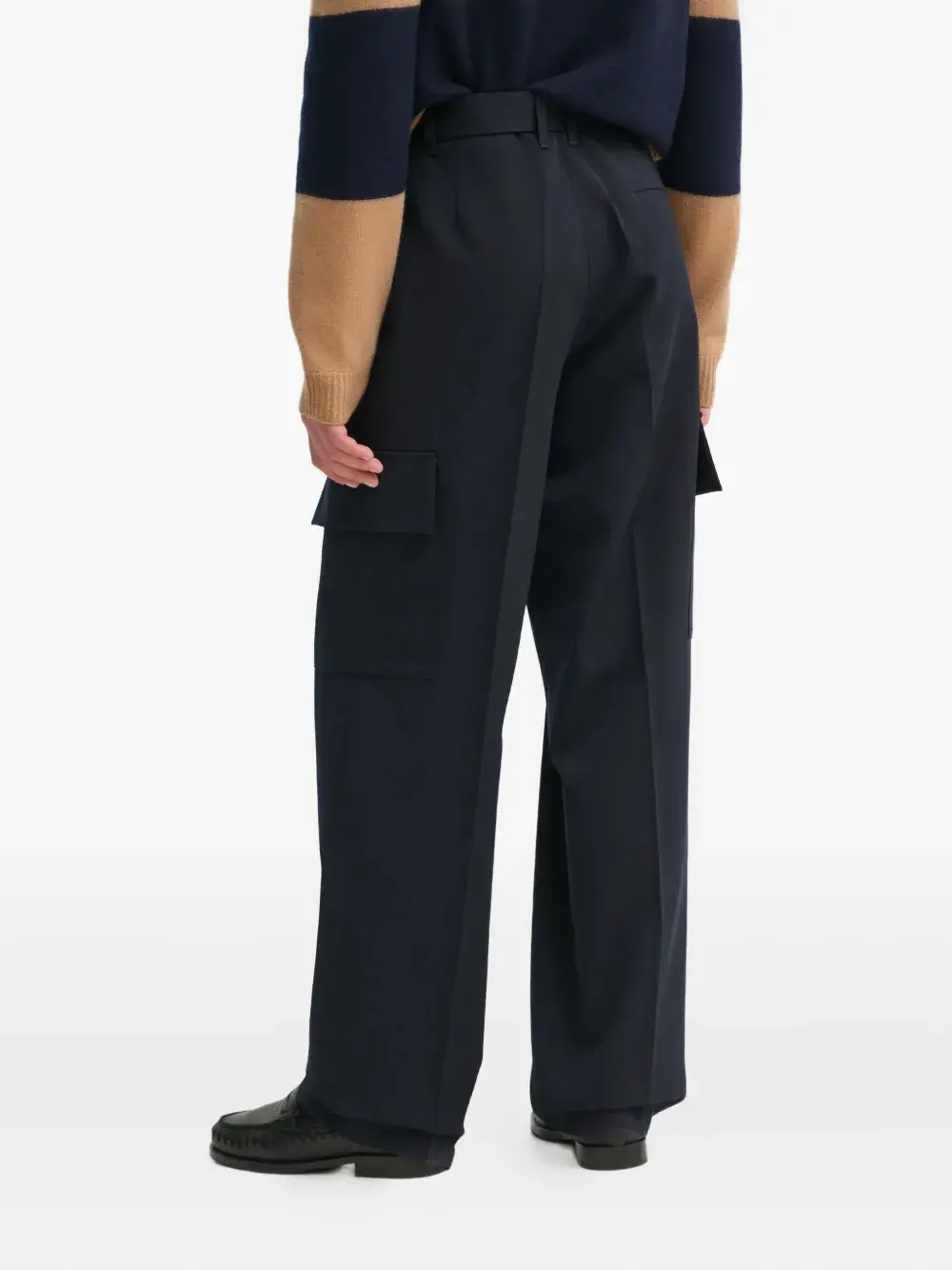 Темно-синий ремень, боковой карман карго, пряжка серебристого цвета, складки, шлевки для ремня