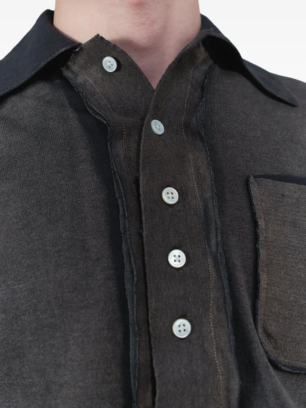 Потертый черный цвет, застежка на пуговицы, нагрудный карман, отложной воротник, длинные рукава