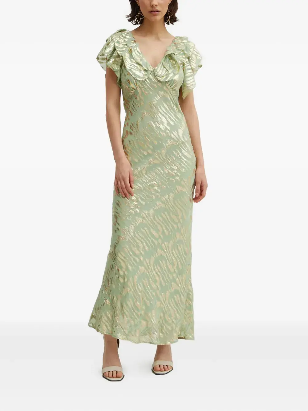 Лаймовое макси-платье с металлическим принтом, V-образным вырезом, короткими рукавами и оборками