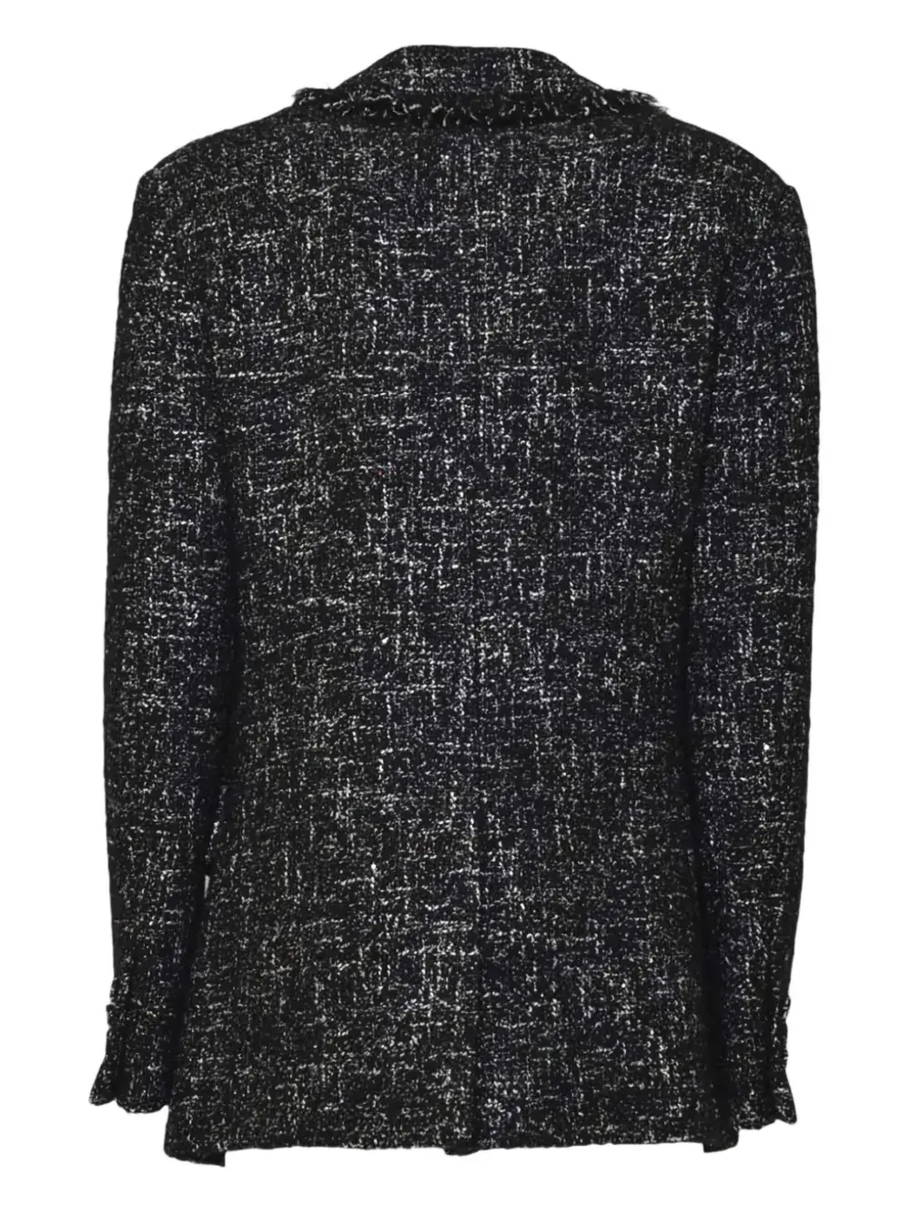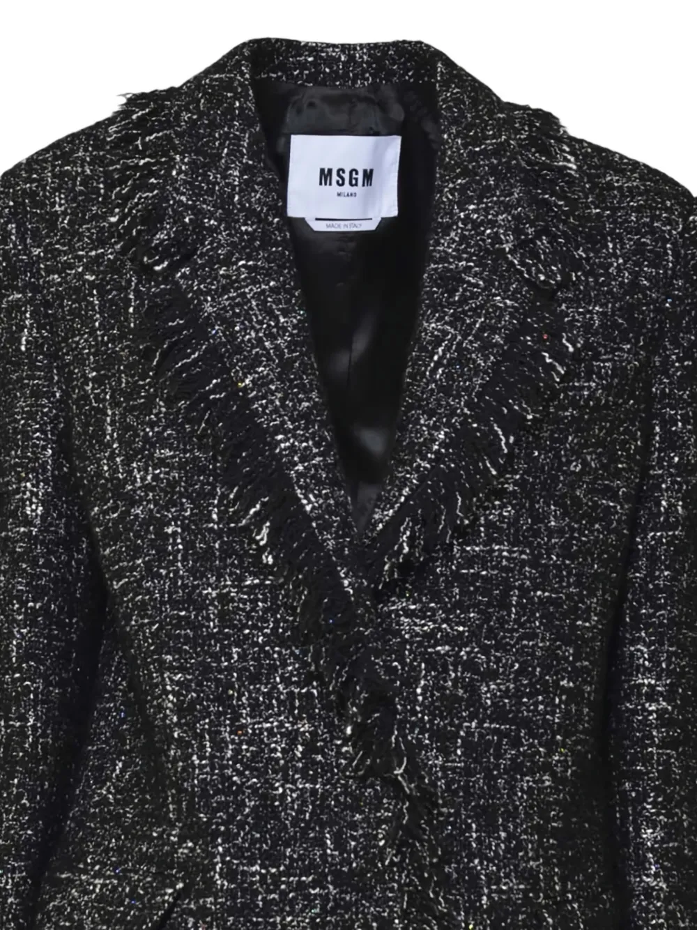 Черные лацканы с бахромой, застежка на пуговицы спереди, передний клапан кармана, длинные рукава