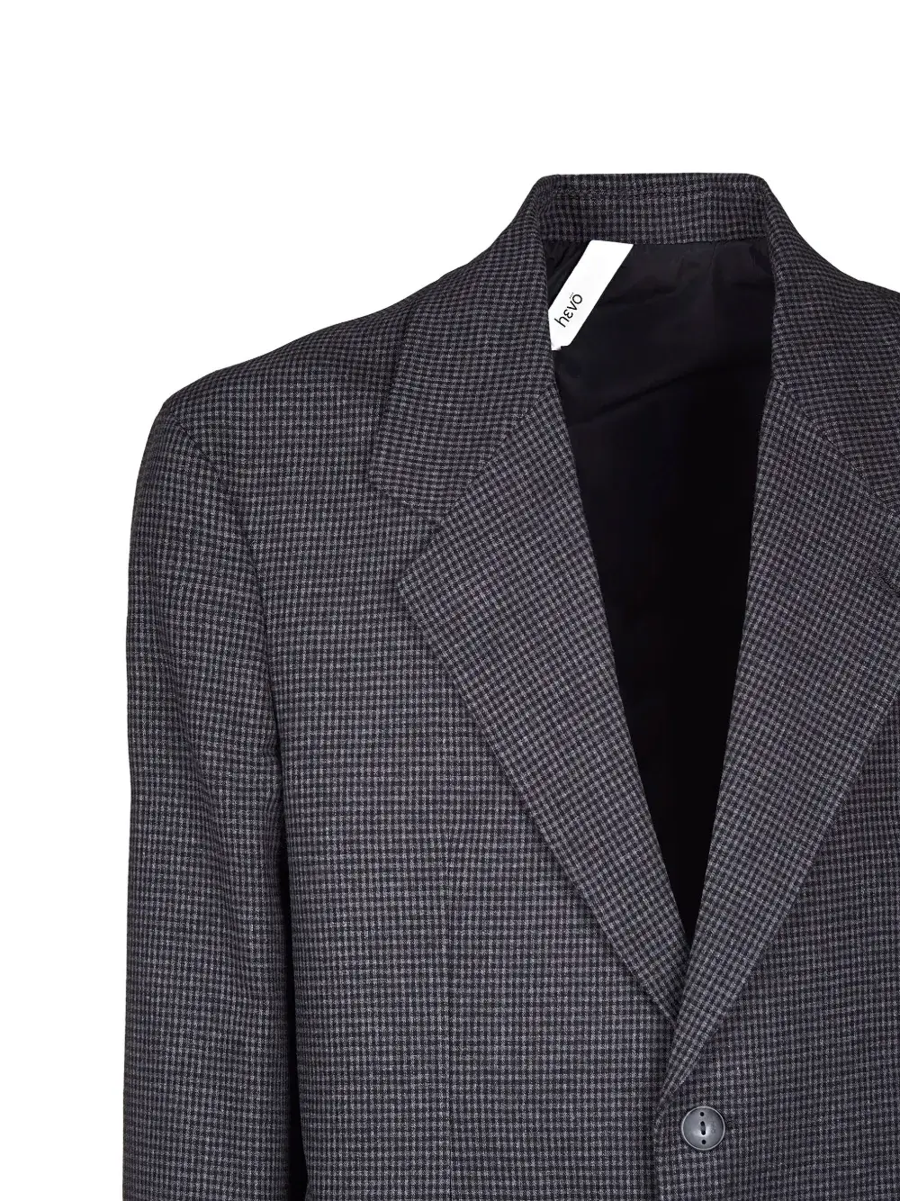 Серо-черная клетчатая расцветка, застежка на пуговицы, лацканы с вырезом, накладные карманы спереди
