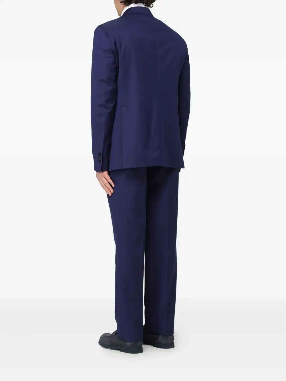 Синие лацканы-шалька, застежка на две пуговицы, прорезные карманы с клапанами, манжеты на пуговицах