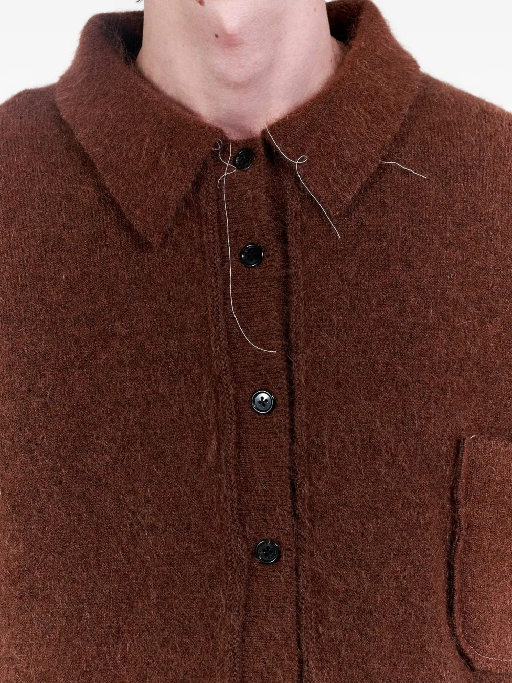 Коричневая рубашка с застежкой на пуговицы, нагрудным карманом, отложным воротником и прямым подолом