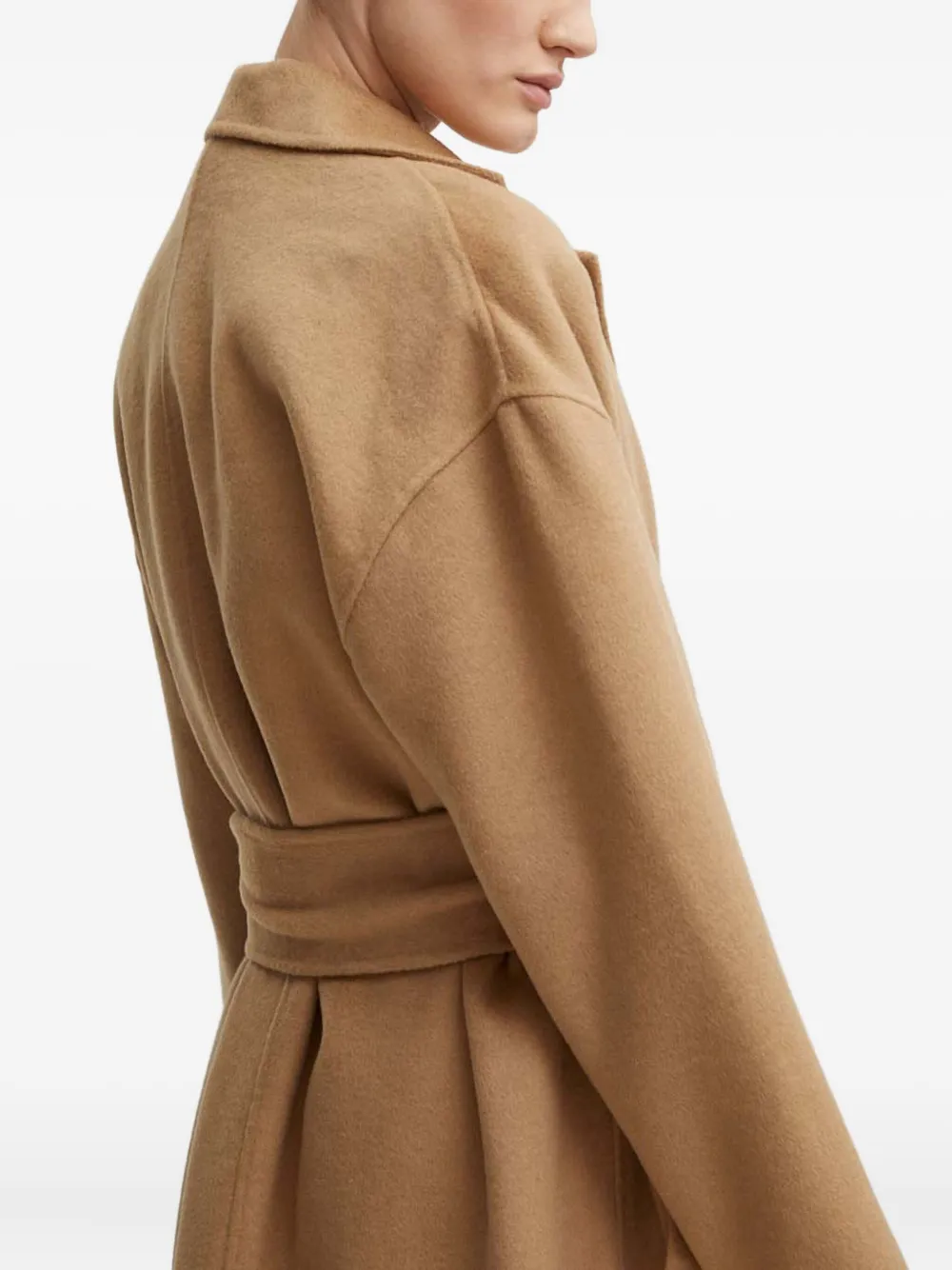 Коричневый цвет, лацканы с вырезом, пояс на талии, длинные рукава, боковые разрезы, длина ниже колена