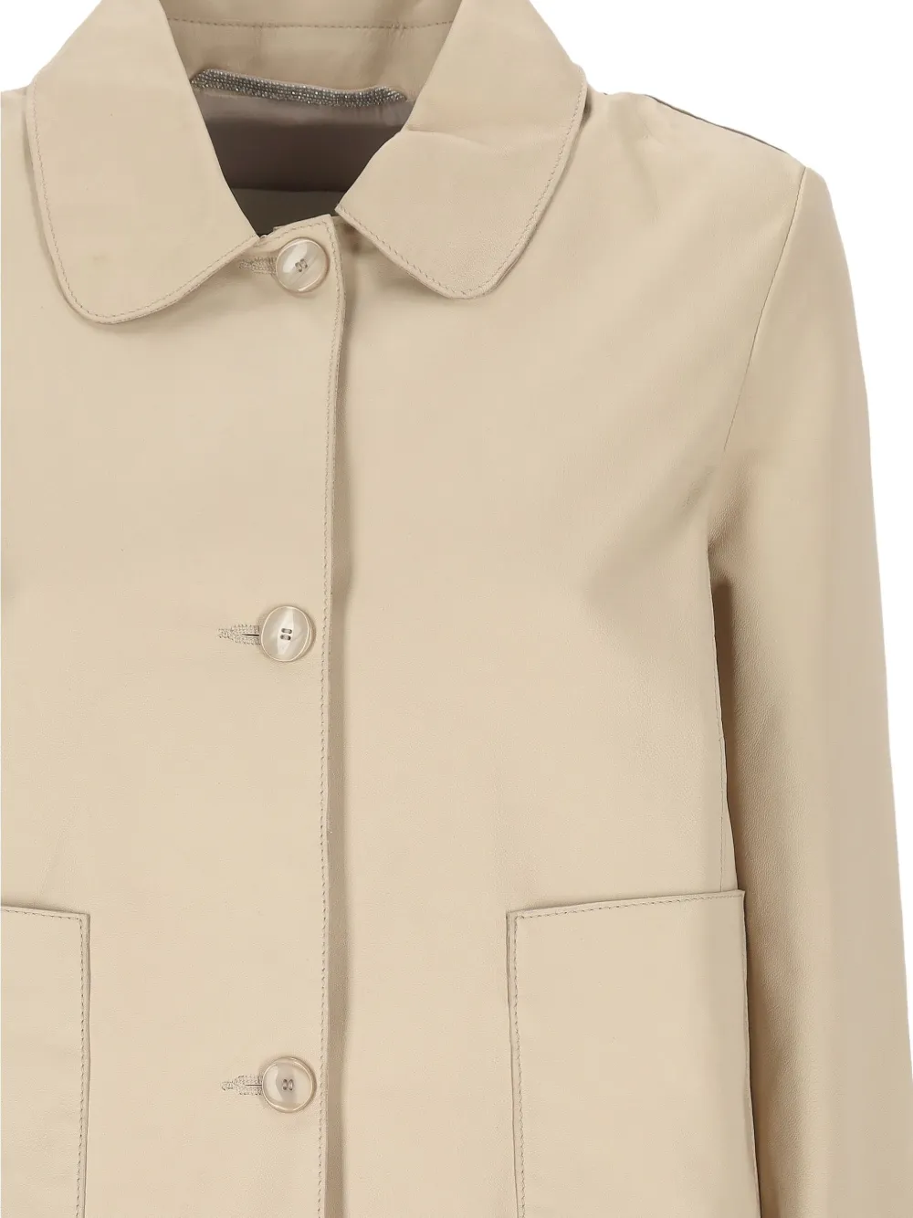 Светло-кремовый цвет, круглый воротник, застежка на пуговицах, накладные карманы спереди, длинные рукава
