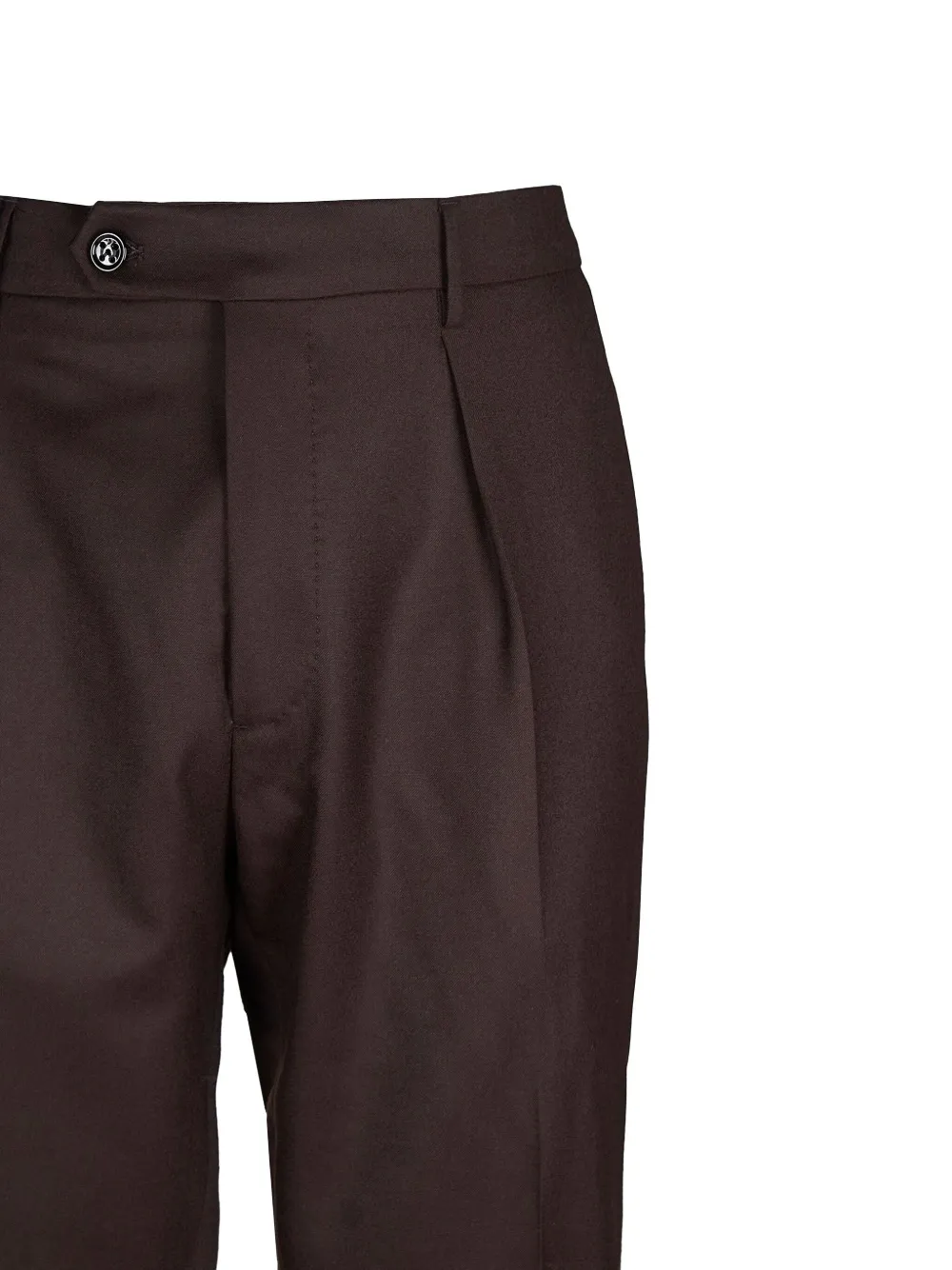 Коричневые брюки с застежкой на пуговицы, шлевками для ремня, подворотами на концах брюк и защипами спереди