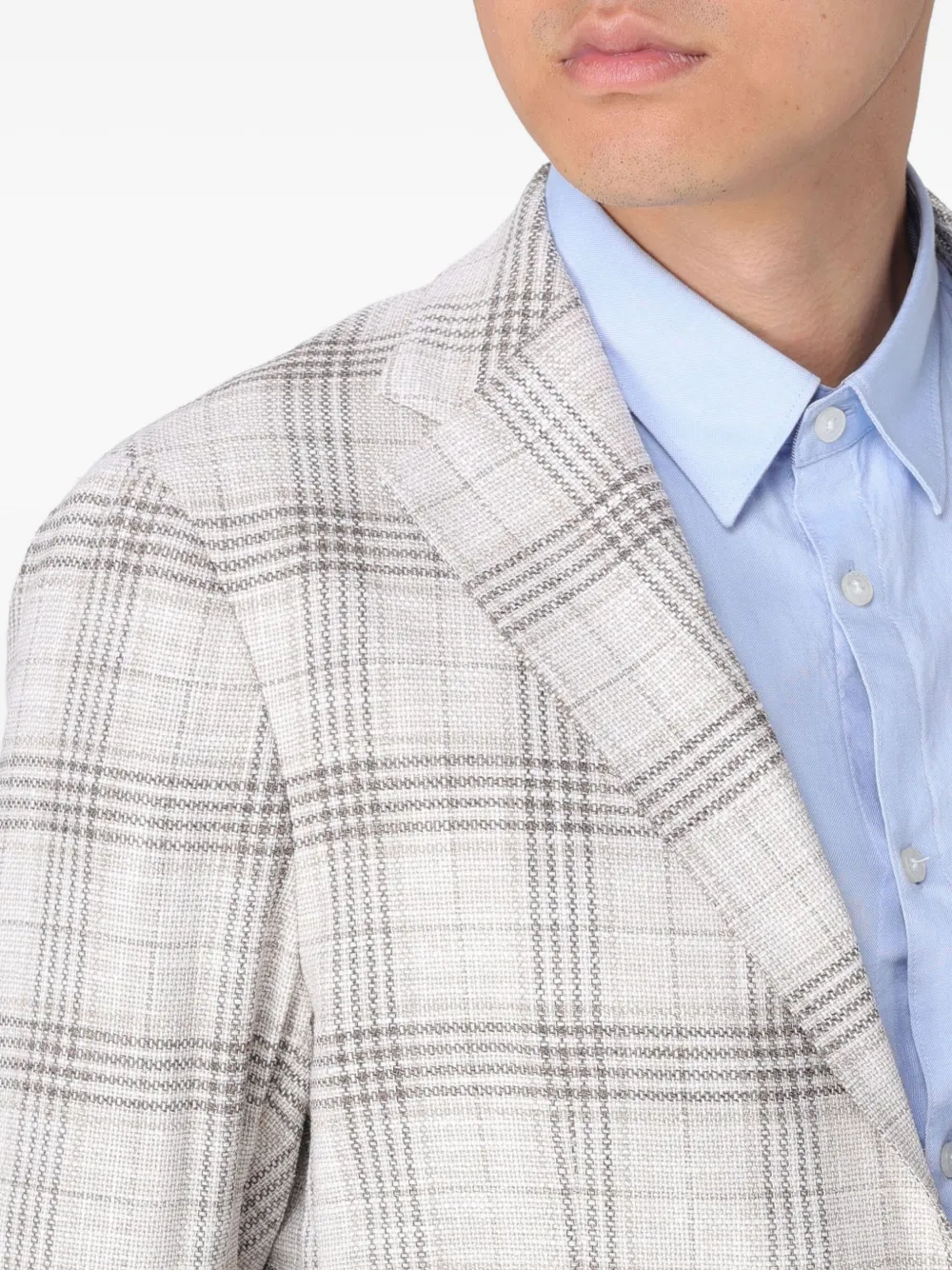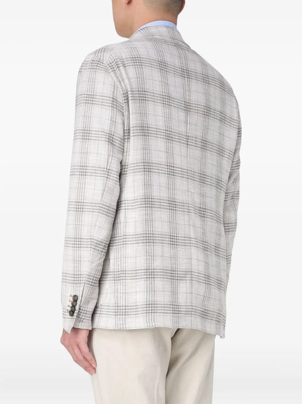 Светло-серый пиджак в клетку, застежка на пуговицы, лацканы с вырезом, длинные рукава, манжеты на пуговицах