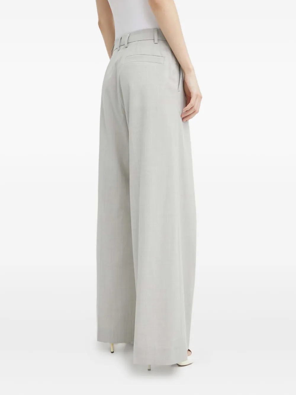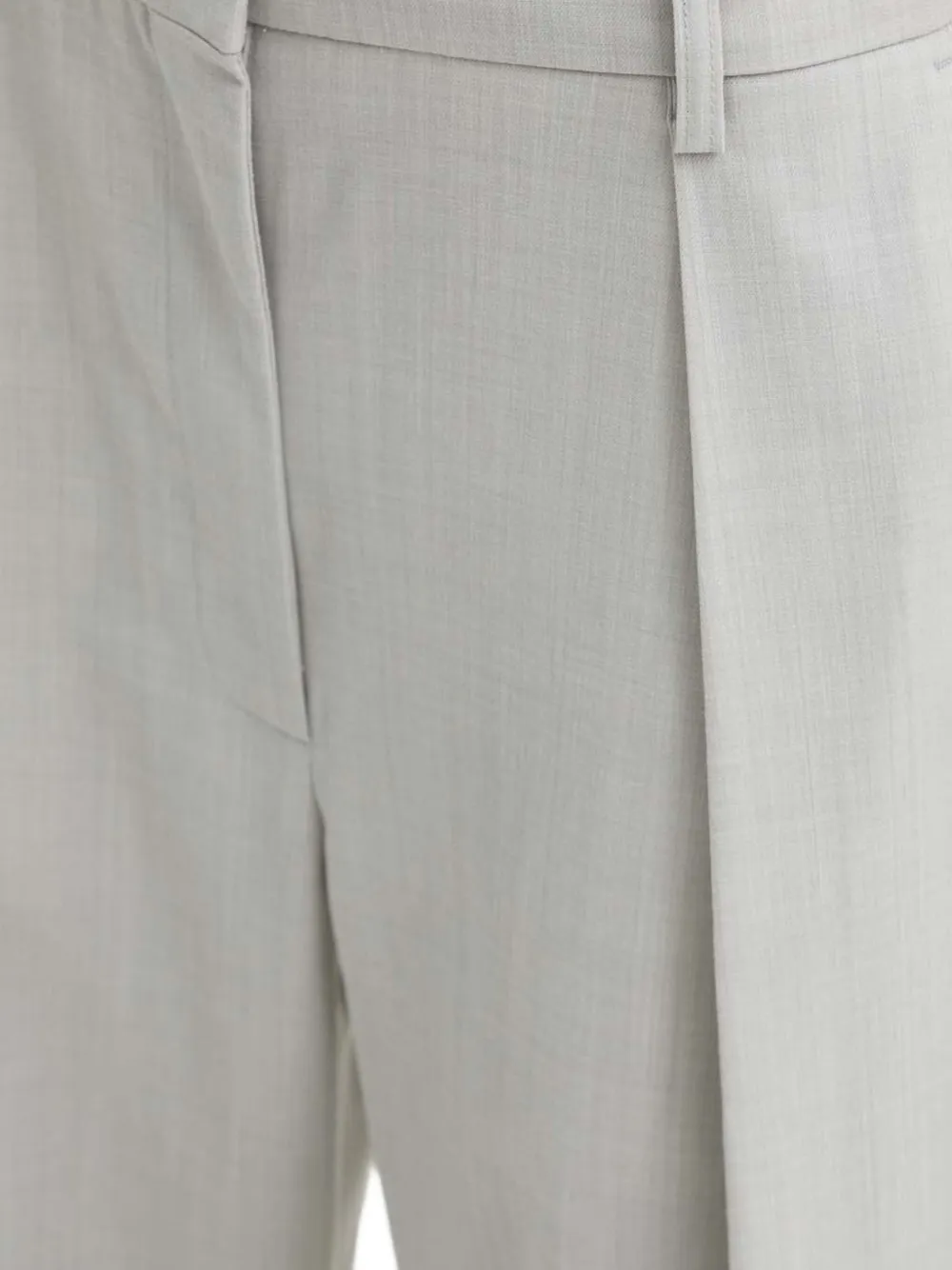 Светло-серый, шлевки для ремня, складки, боковые карманы в швах, задний карман в рамку, потайная застежка спереди