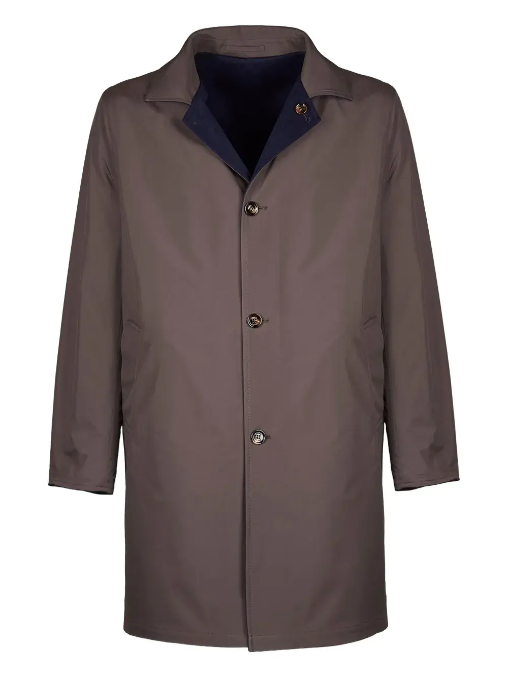 Синий и коричневый, застежка на пуговицы, длинные рукава, воротник с острыми уголками, прямой подол, двусторонний