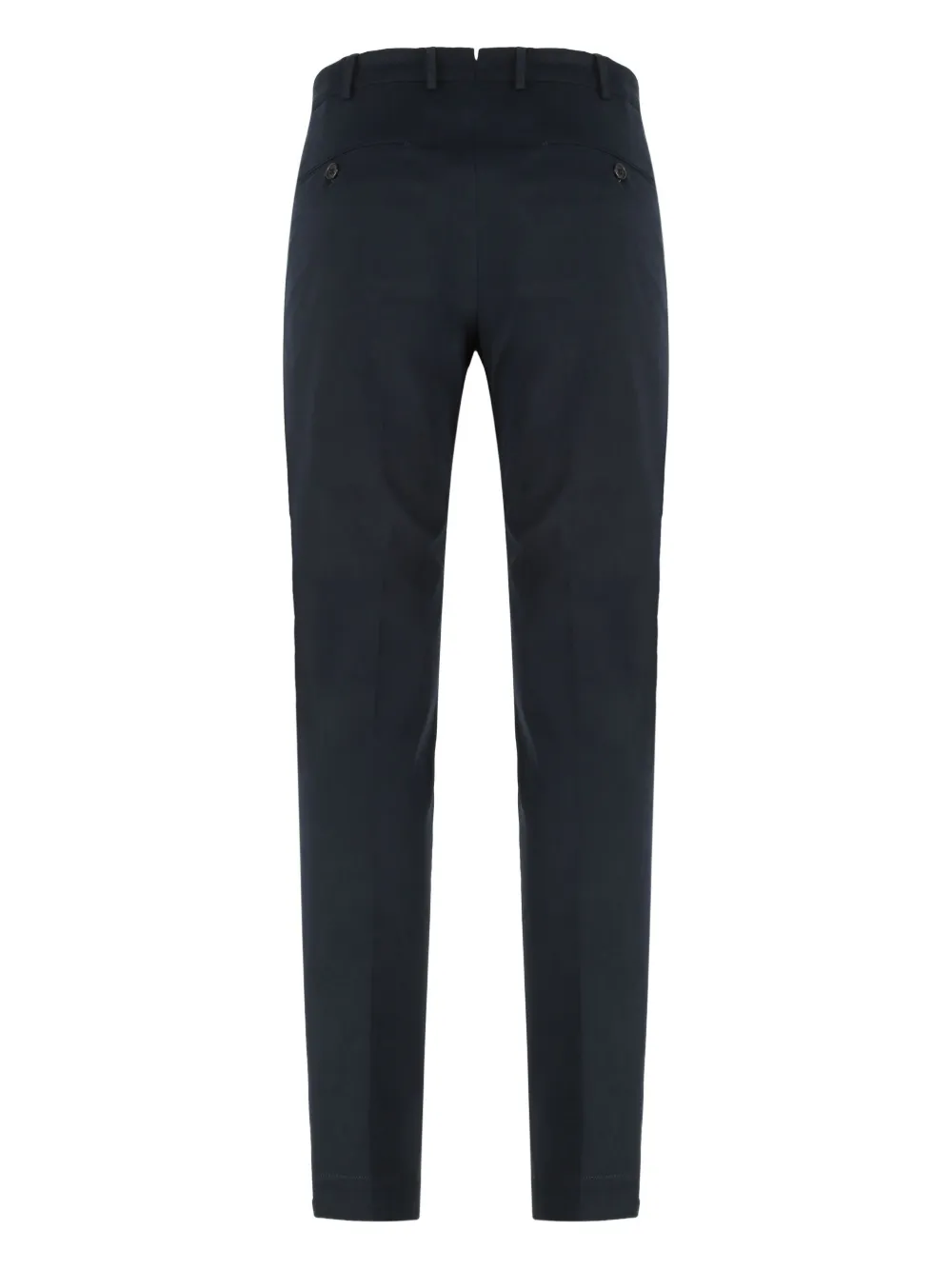 Темно-синие, шлевки для ремня, застегивается на пуговицу, задний прорезной карман, прямые брюки стандартной длины