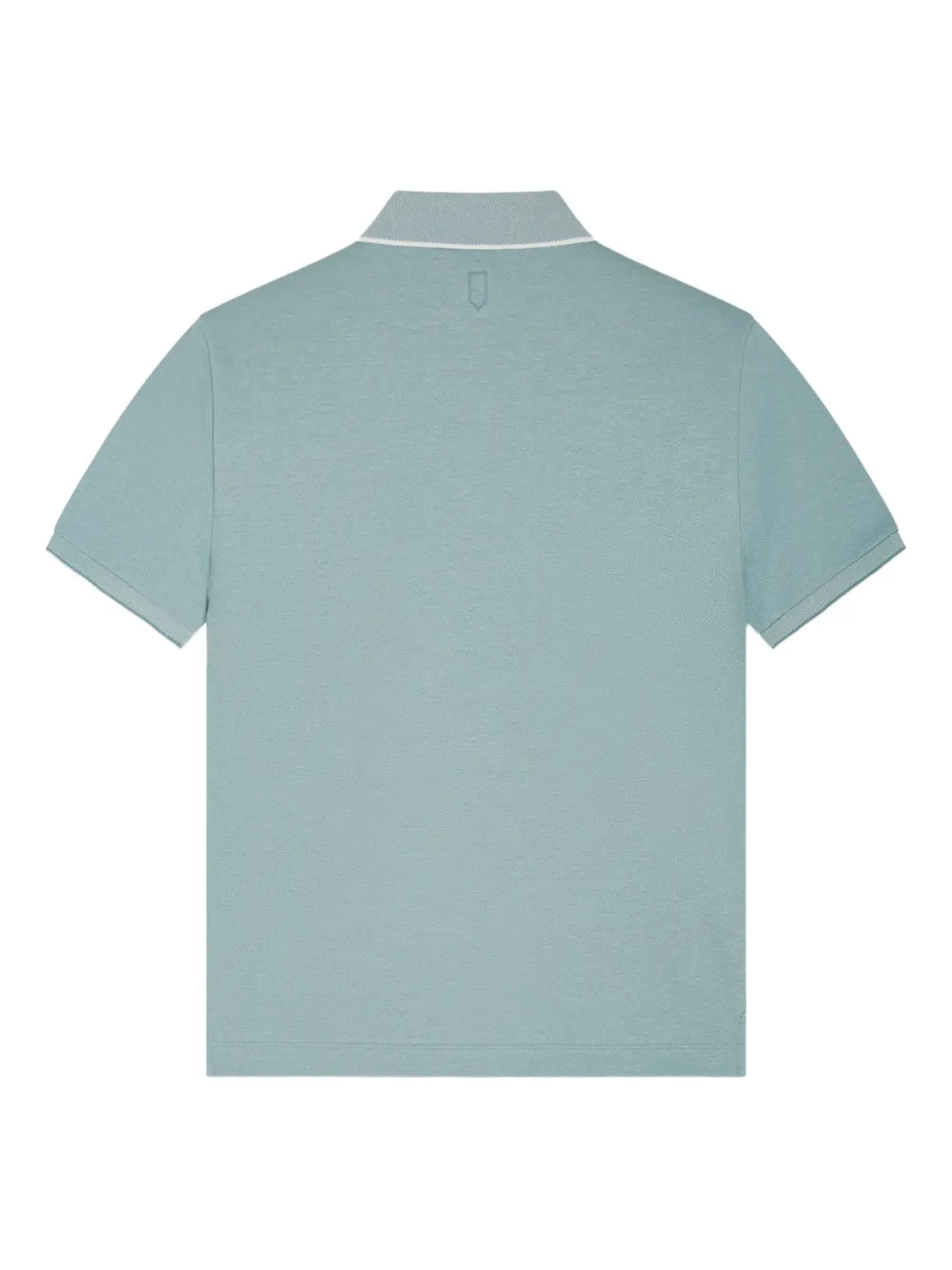 Светло-голубой трикотаж пике, контрастная отделка на воротнике, короткие рукава, застежка на пуговицы, прямой подол