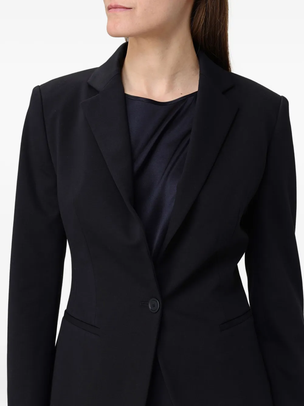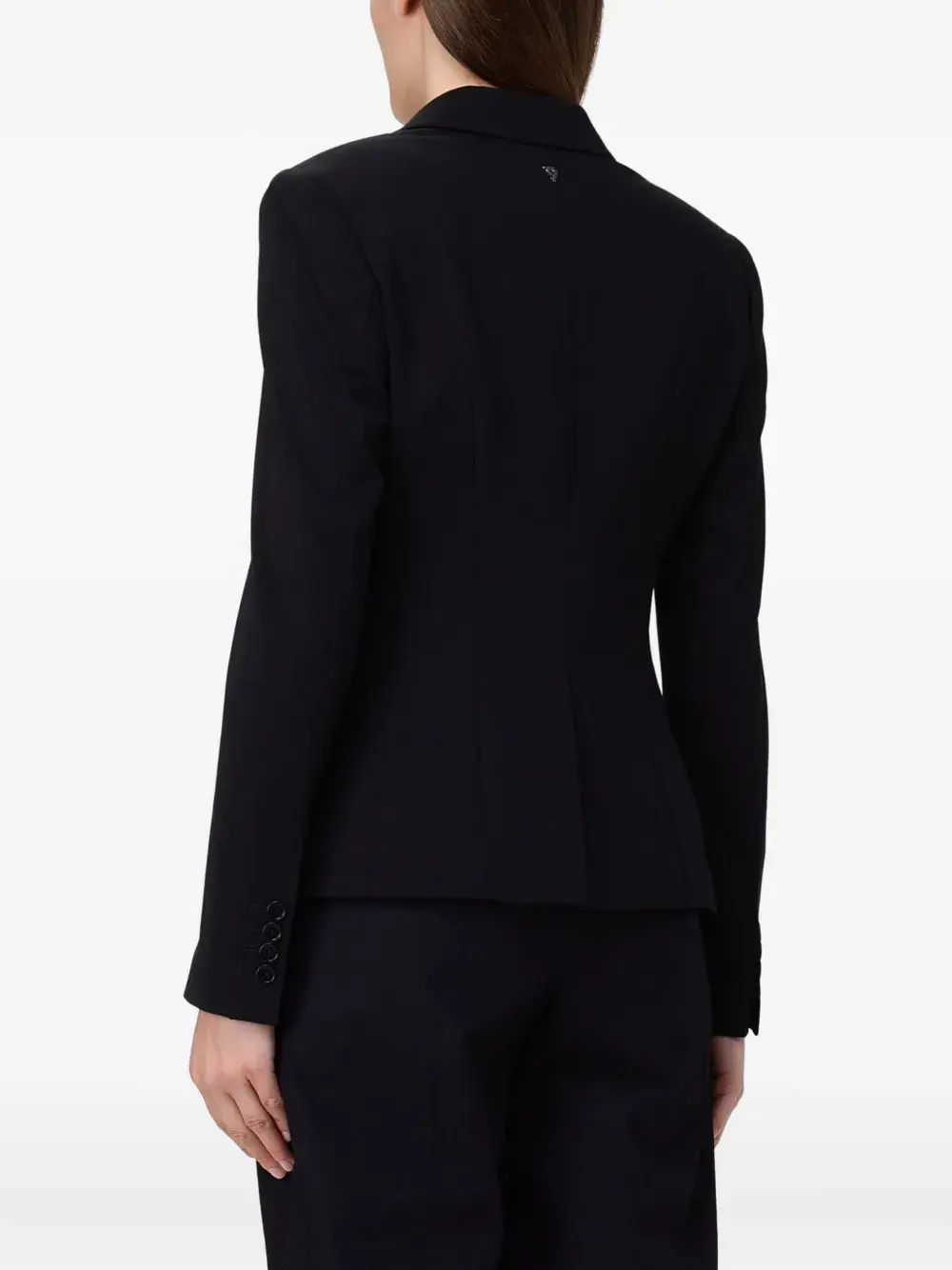Черный однобортный пиджак, застежка на пуговицы, лацканы с вырезом, передние прорезные карманы, манжеты на пуговицах