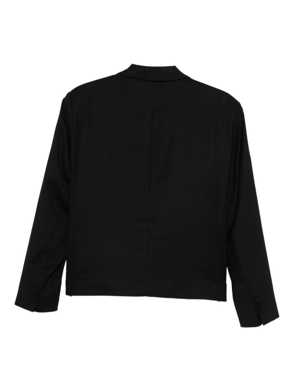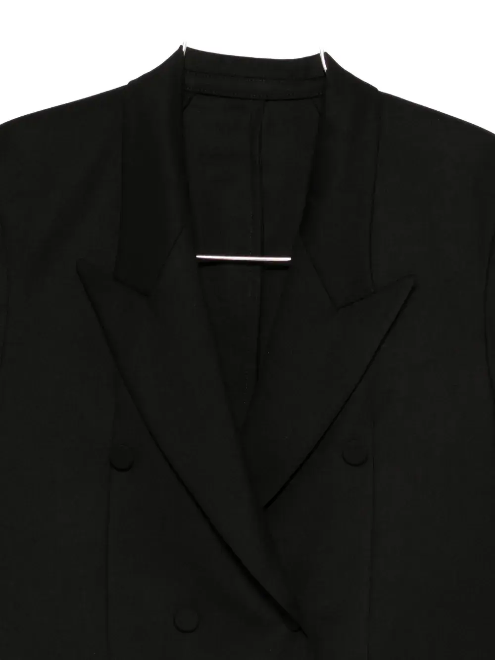 Черный двубортный пиджак с острыми лацканами, передними клапанными карманами, застежкой на пуговицы и длинными рукавами