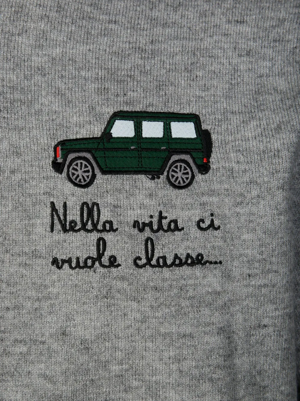 Светло-серый свитер с круглым вырезом, длинными рукавами, вышивкой в виде машины, вышитыми деталями и ребристым подолом