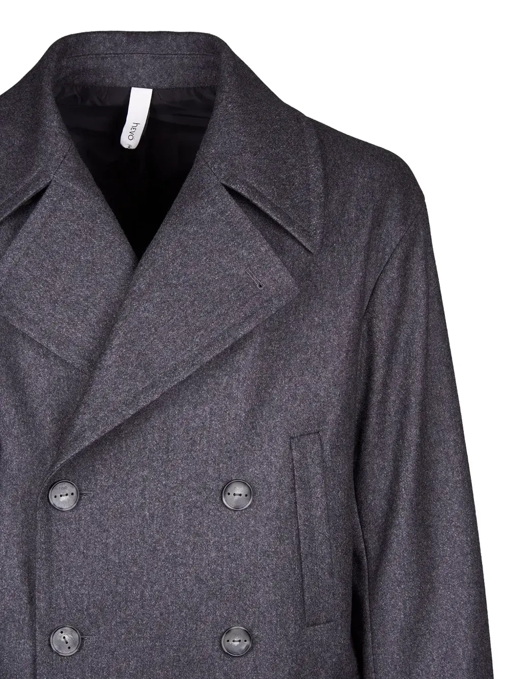 Антрацитово-серый двубортный пиджак, застежка на пуговицы, лацканы с вырезом, передние клапанные карманы, длинные рукава