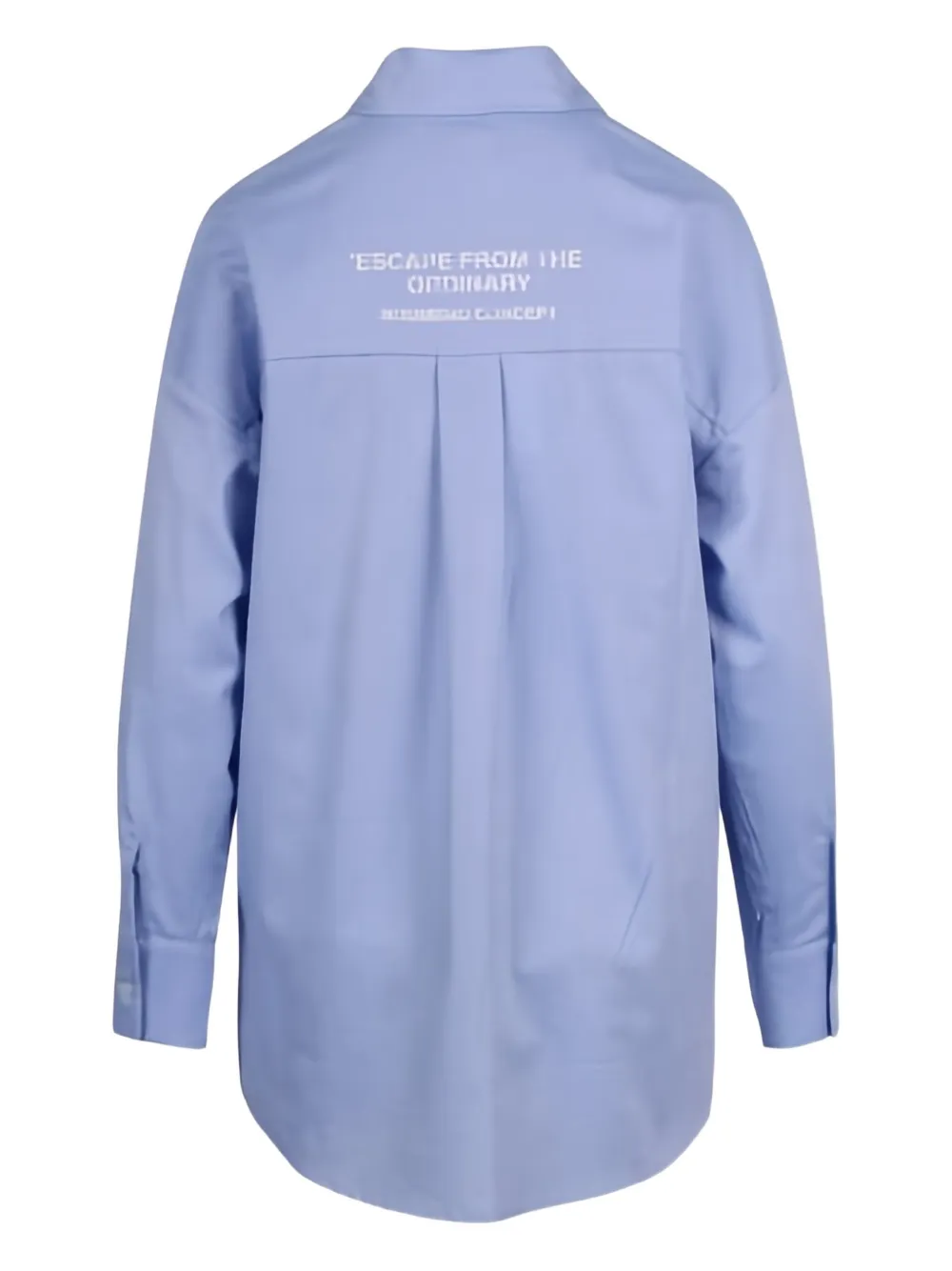 Светло-голубая рубашка с нагрудным карманом, застежкой на пуговицы, длинными рукавами, манжетами на пуговицах и надписью