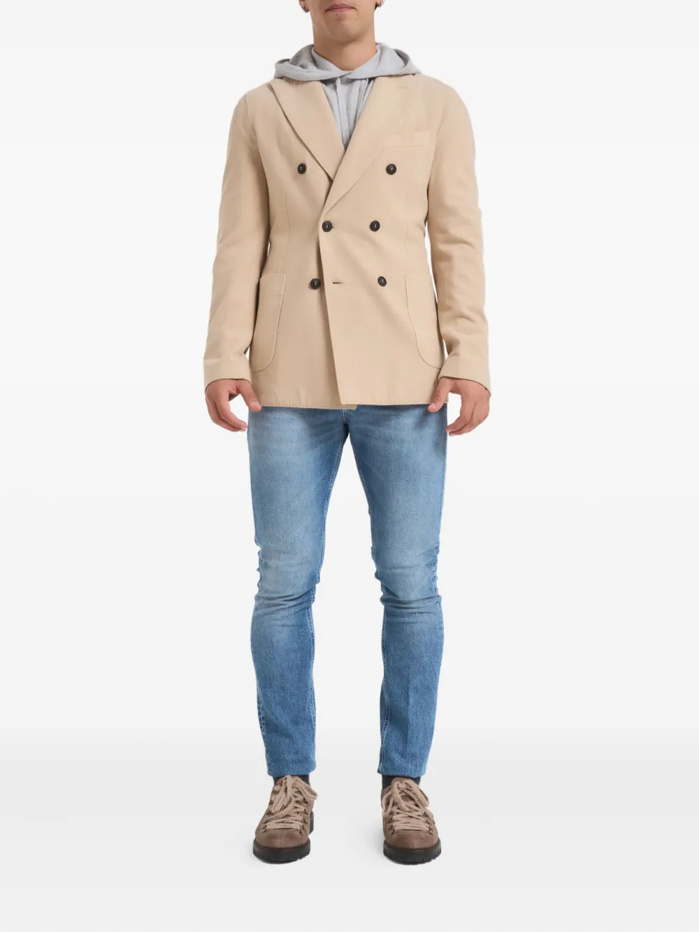 Бежевый двубортный пиджак, застежка на пуговицы, лацканы с острыми концами, накладные карманы спереди, манжеты на пуговицах