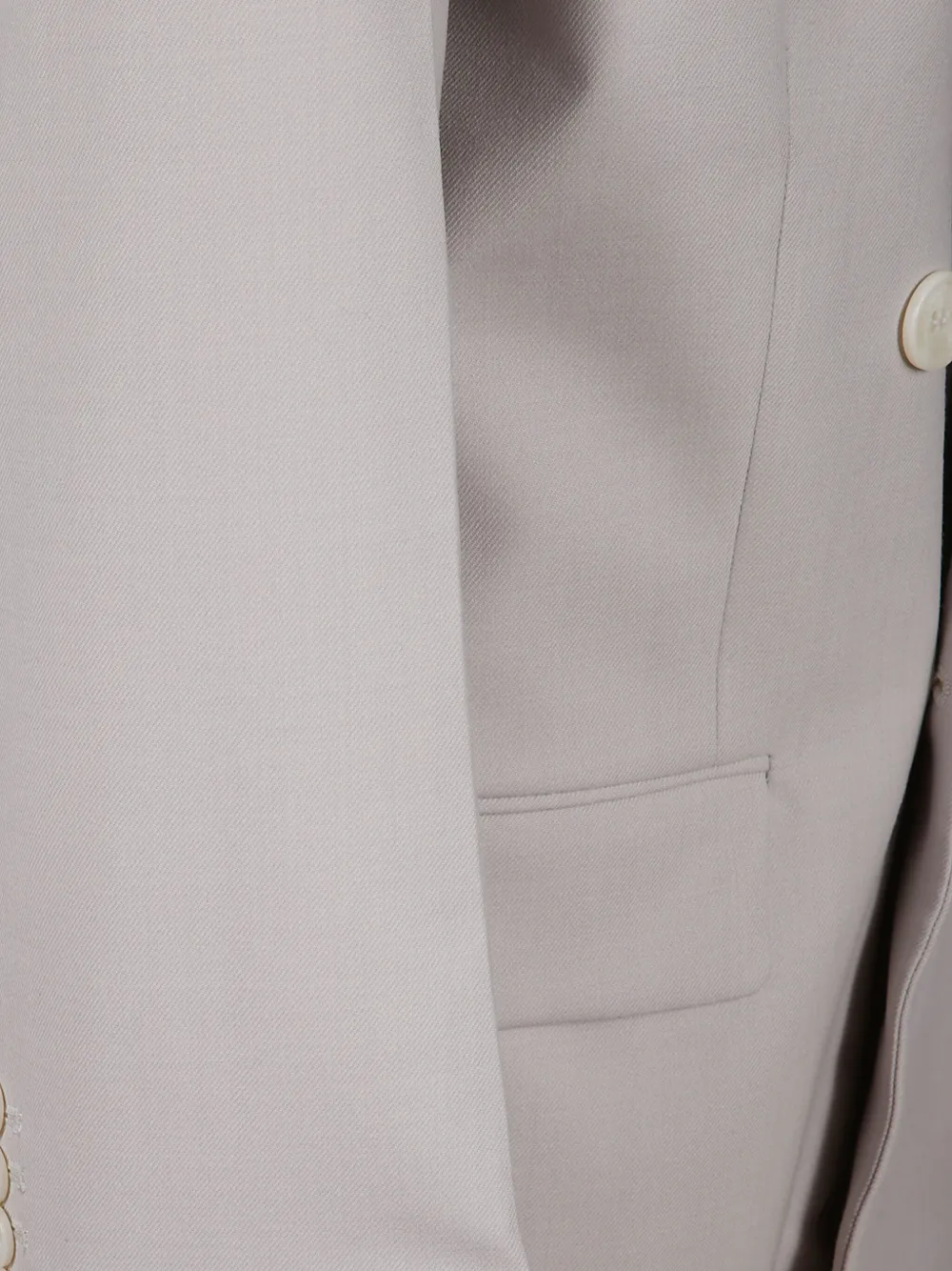 Пепельного цвета двубортная застежка на пуговицы, лацканы с вырезом, прорезные карманы с клапанами, поясная деталь на спинке