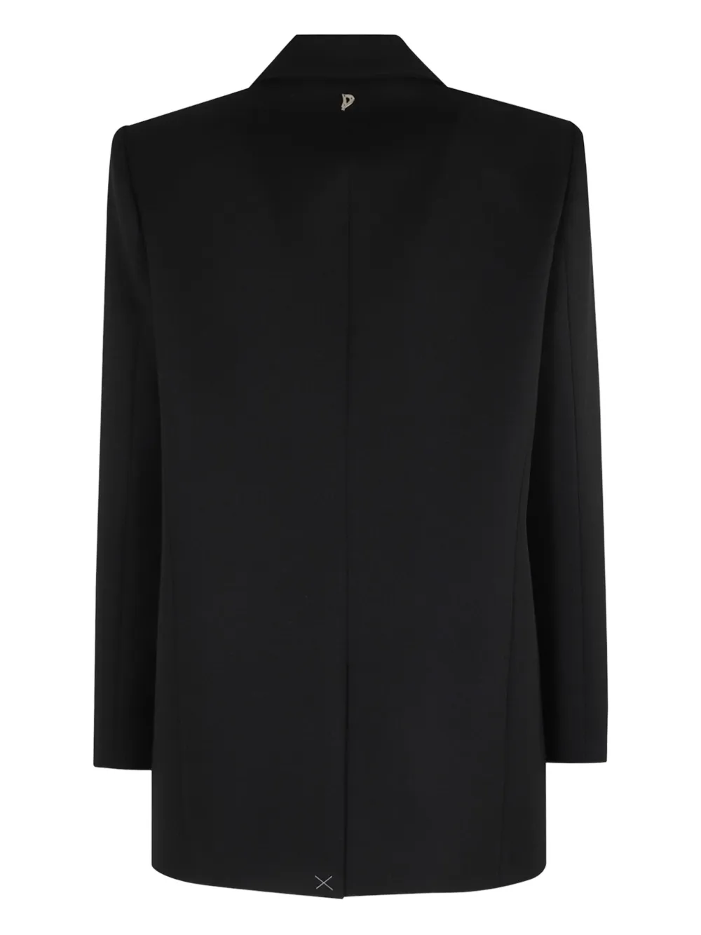 Черный цвет, застежка на одну пуговицу, лацканы с вырезом, передние прорезные карманы с клапанами, длинные рукава, прямой низ