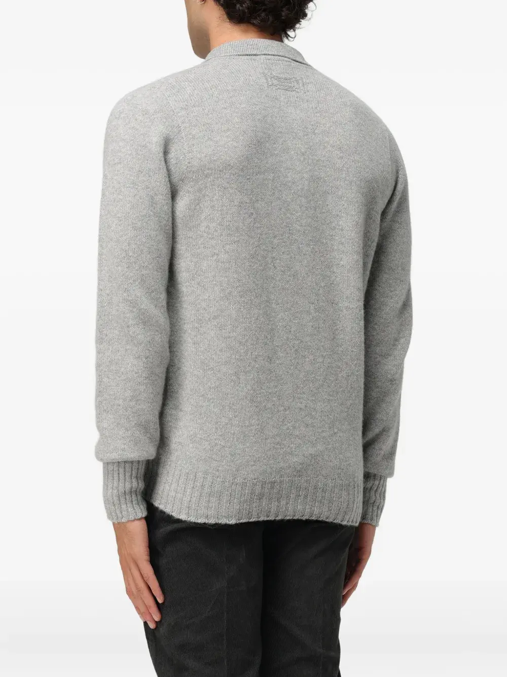 Серый пуловер с рубчатой отделкой, короткой застежкой на пуговицы, отложным воротником-поло, длинными рукавами и прямым подолом