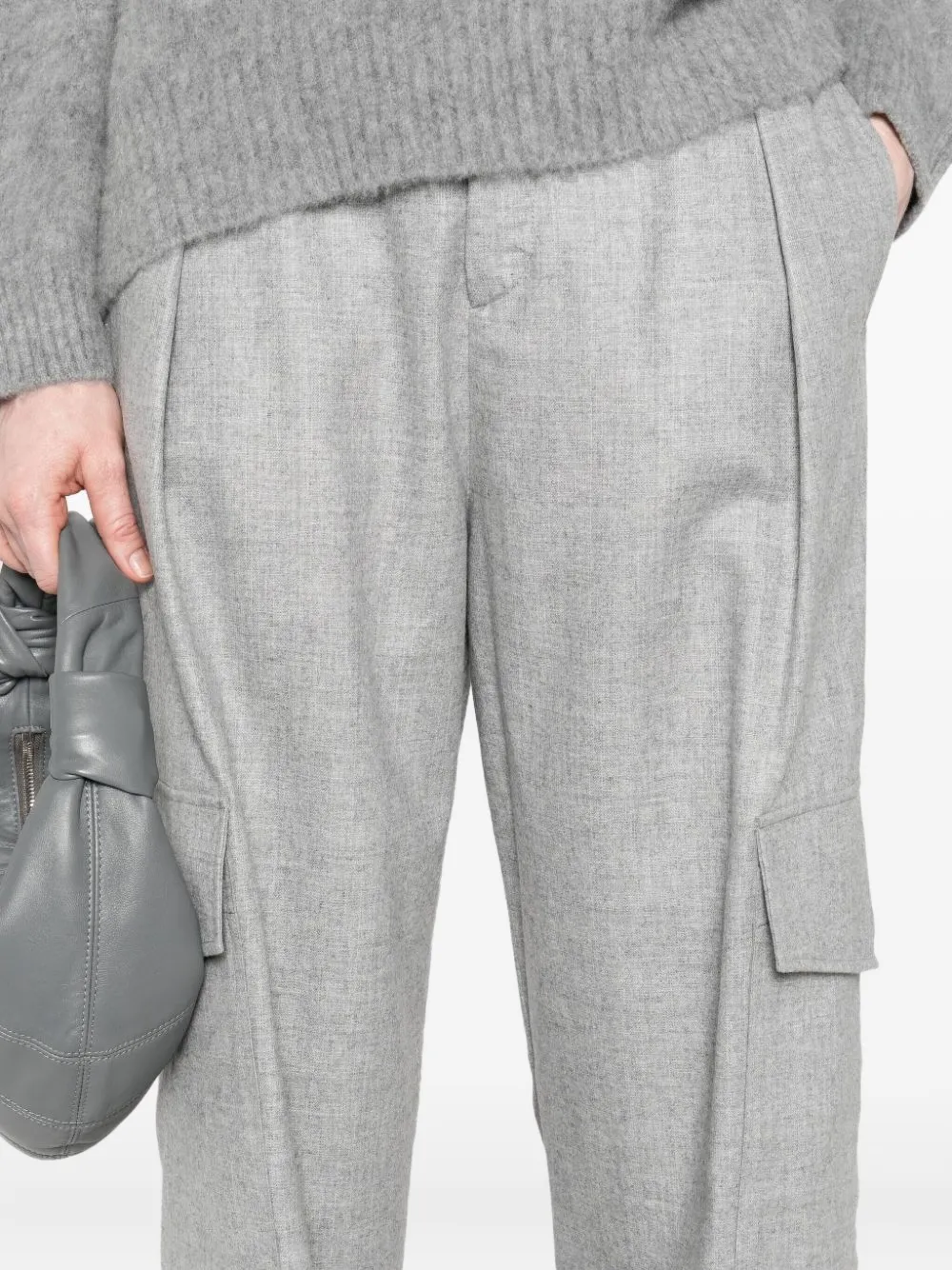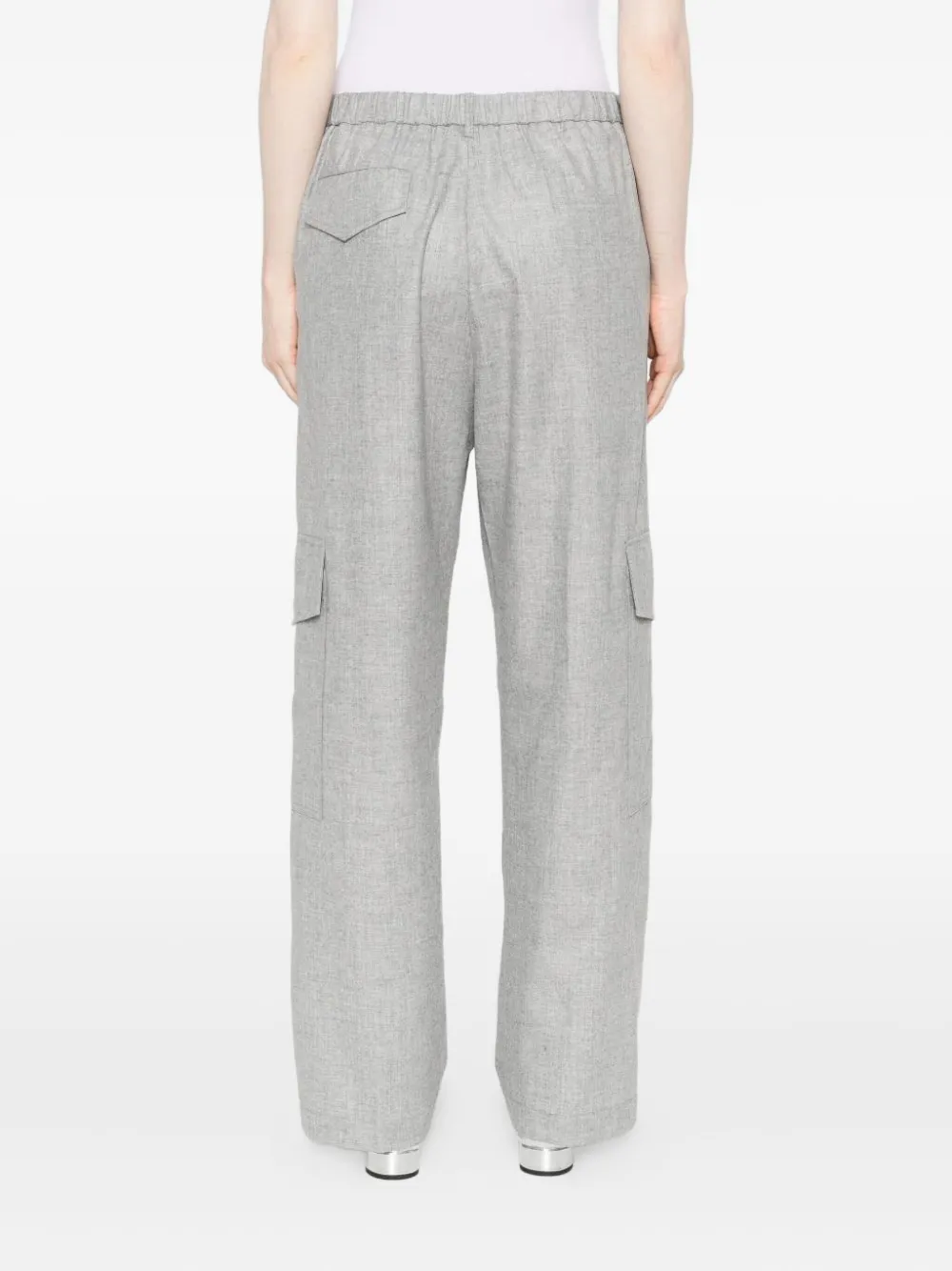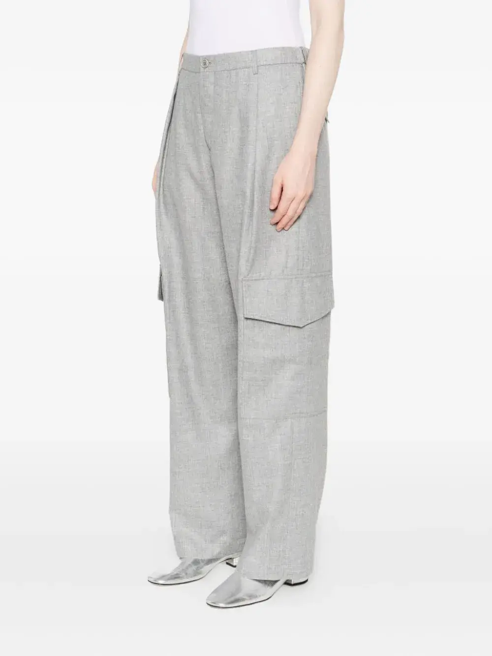 Серые брюки с боковыми карманами-карго, складками спереди, шлевками для ремня, застежкой на пуговицу и прорезным задним карманом