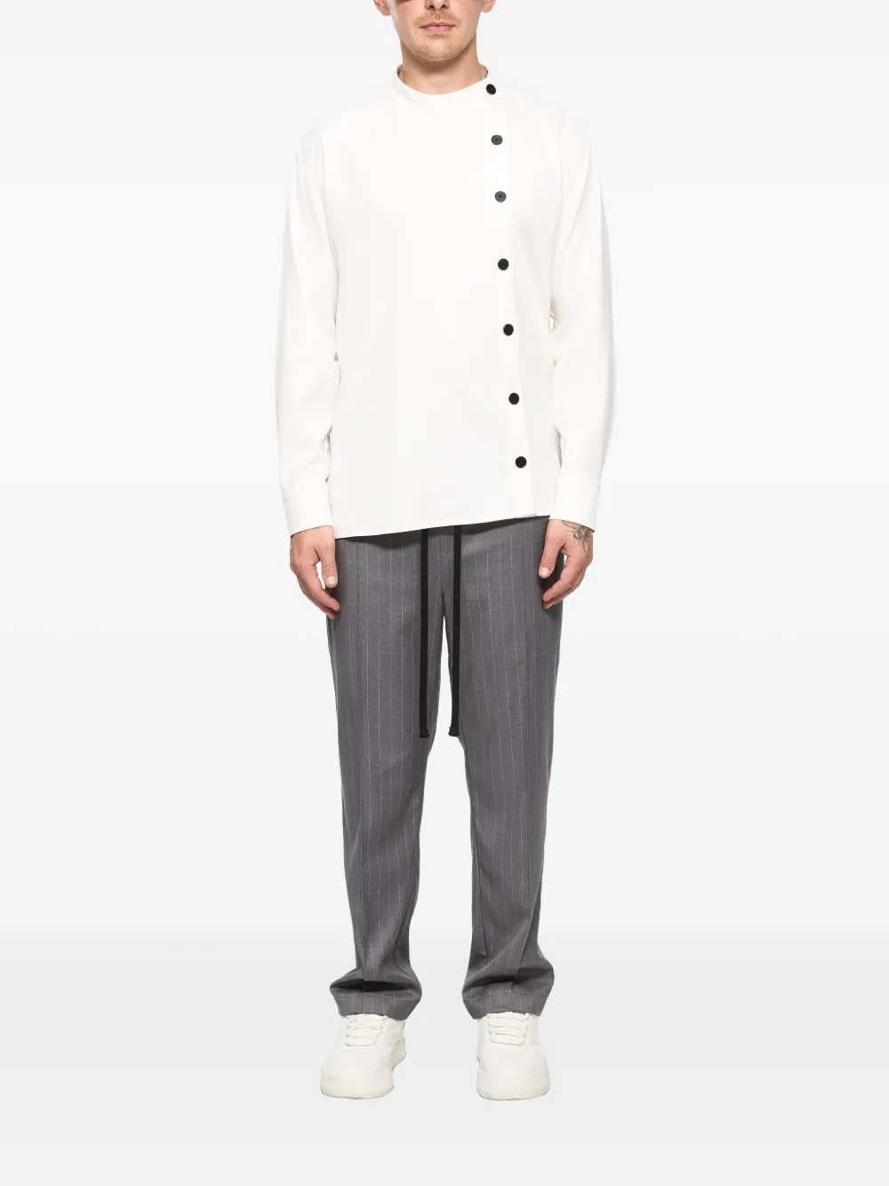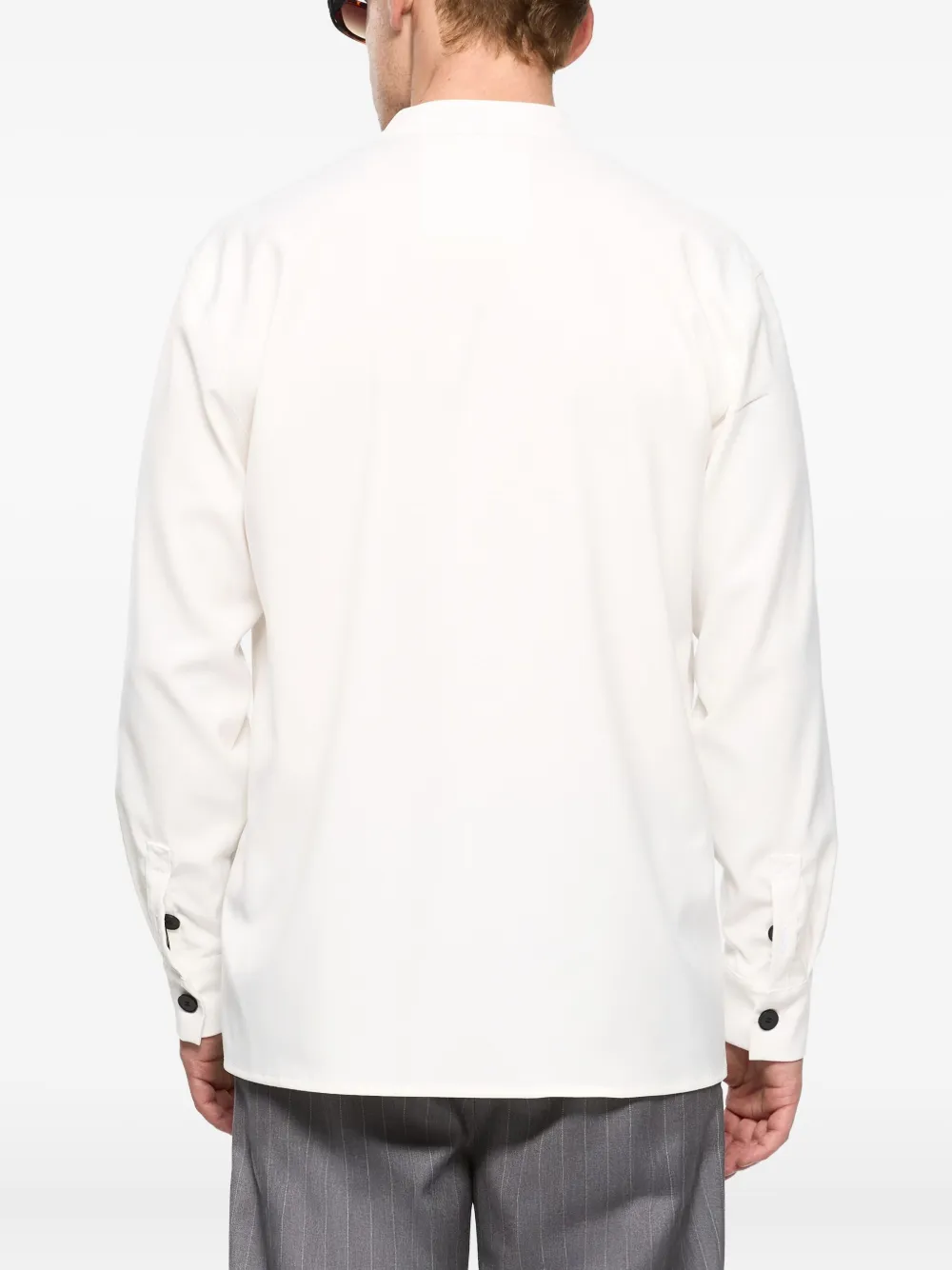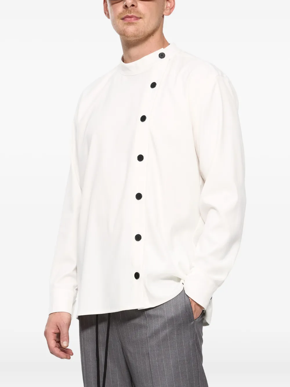 Рубашка цвета экрю с воротником-стойкой, застежкой на пуговицы, длинными рукавами, манжетами на пуговицах и асимметричной планкой