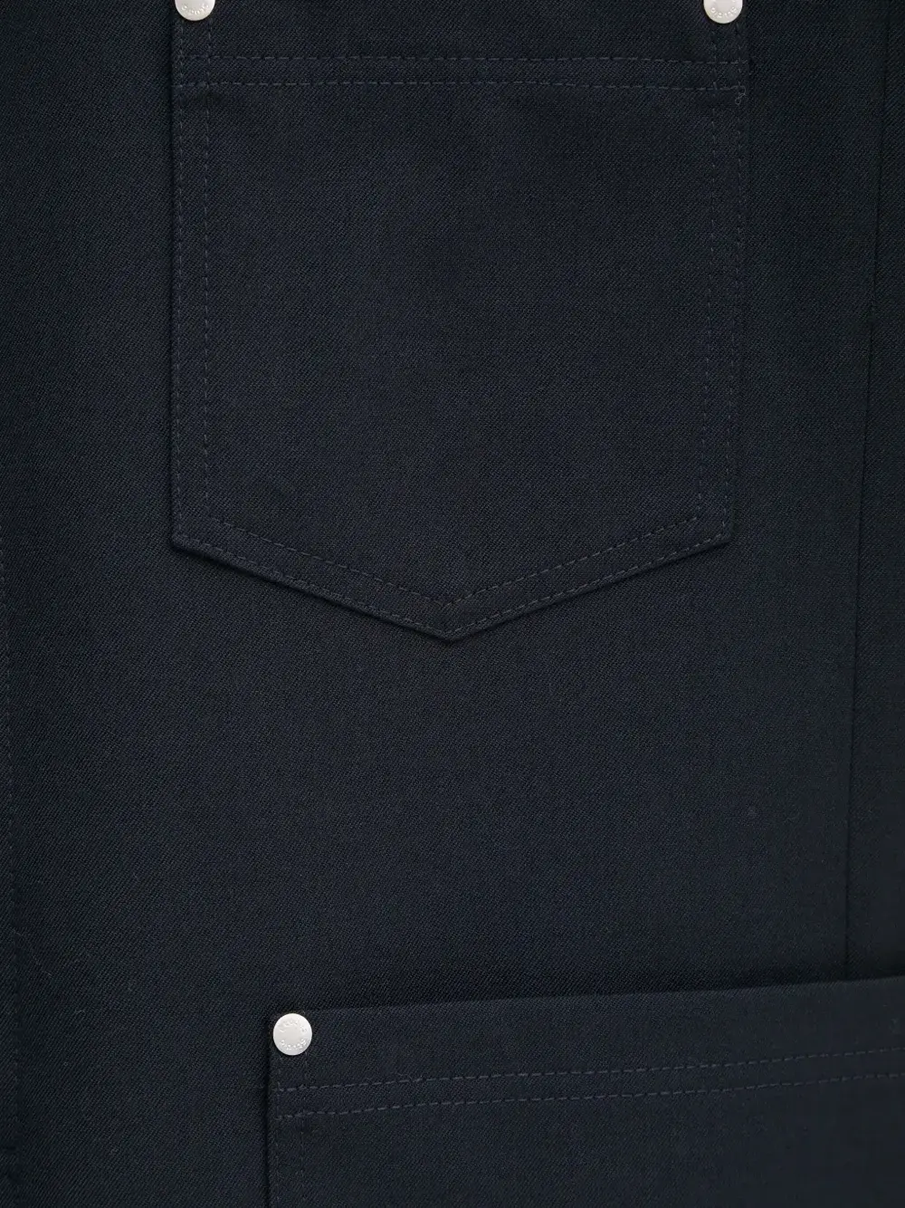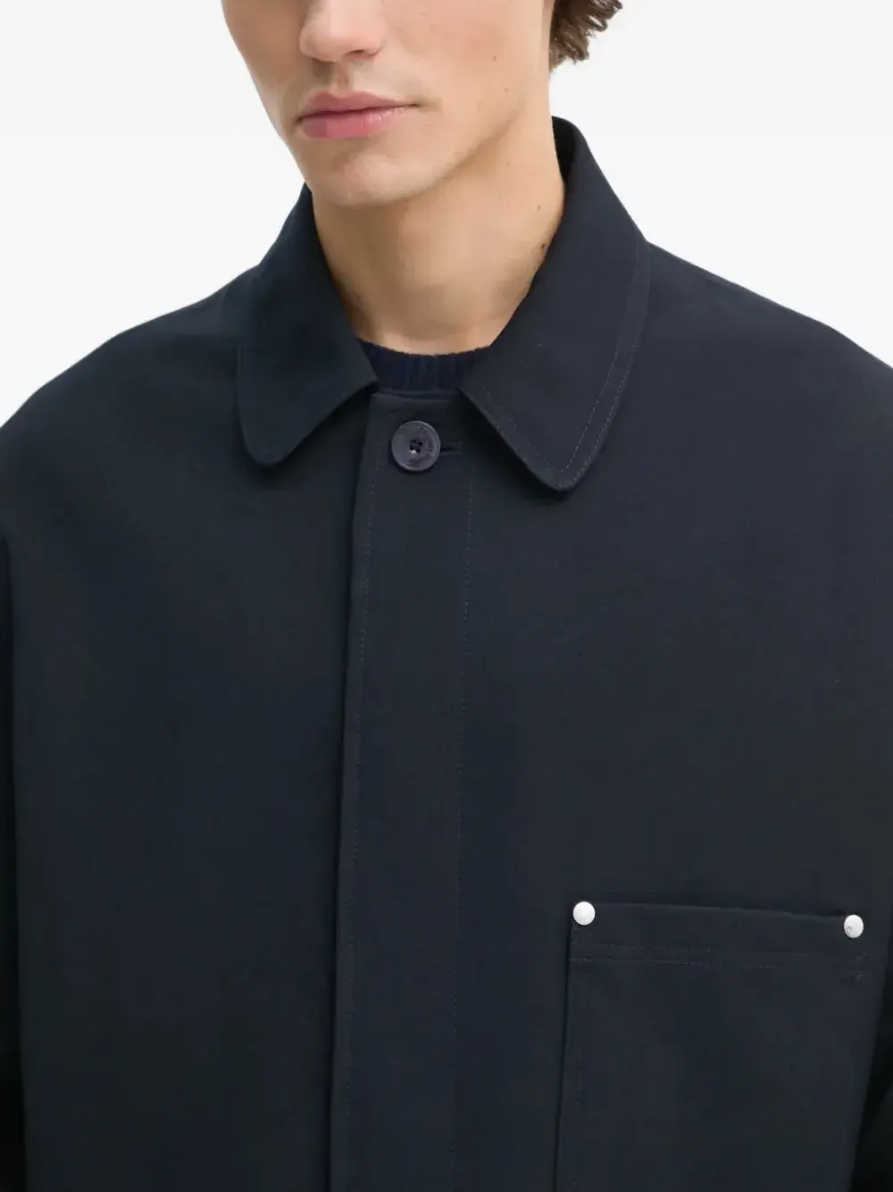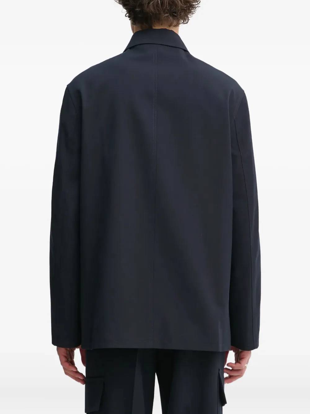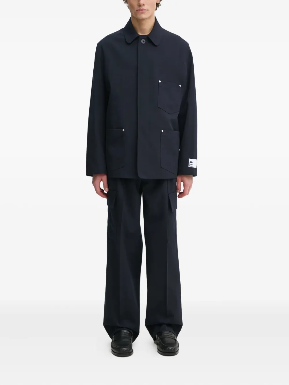 Темно-синий цвет, воротник с острыми концами, застежка на пуговицы спереди, накладные карманы, длинные рукава, нашивка с логотипом