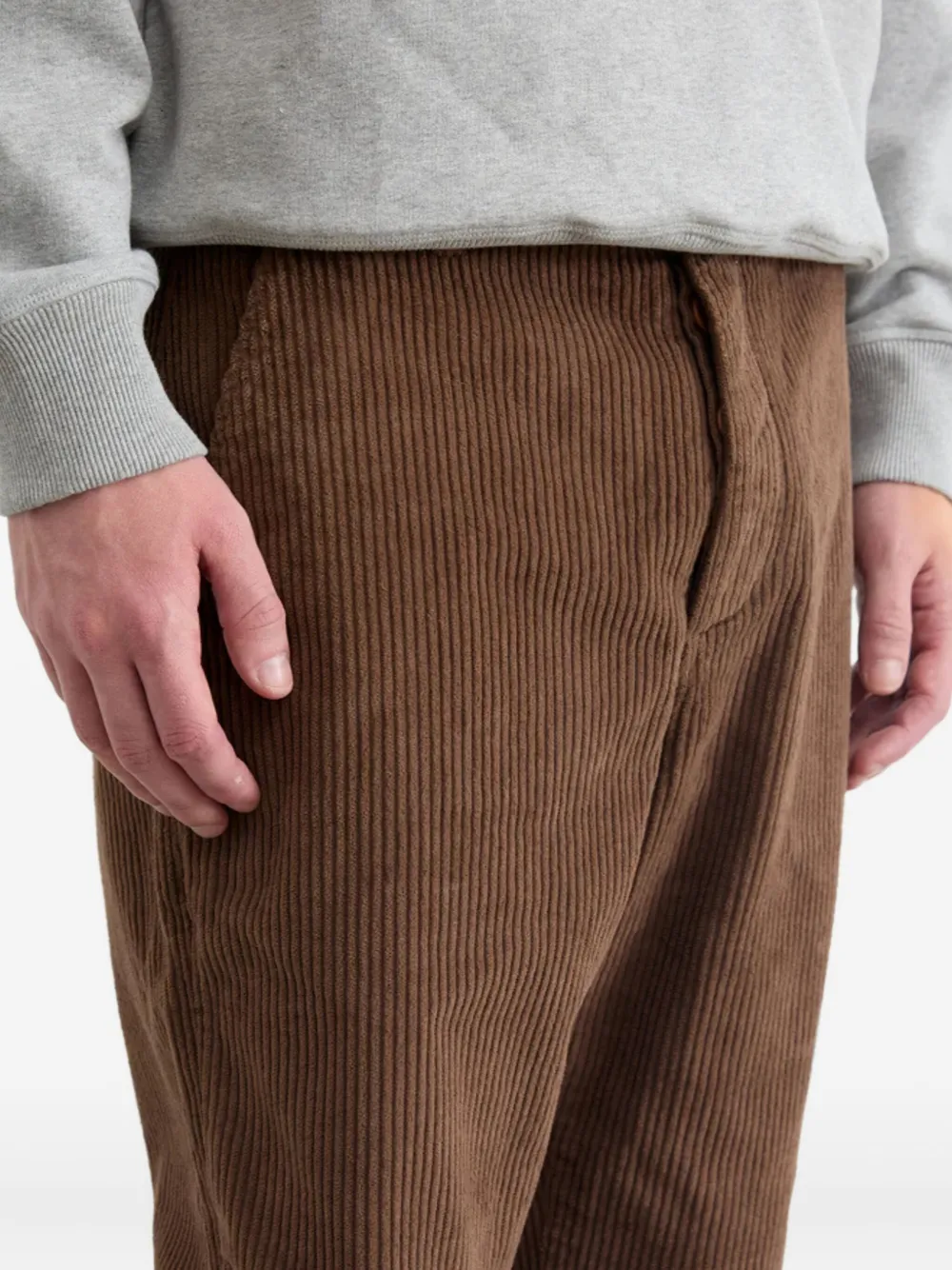 Ткань вельвет шоколадного цвета, текстурированная, подрубленные края, задний карман на пуговице, шлевки для ремня, передние карманы