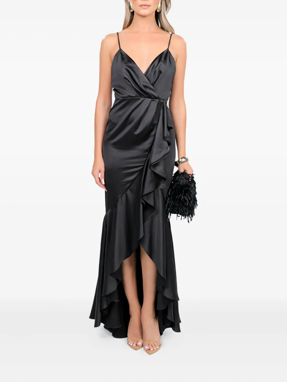 Черное платье с V-образным вырезом, тонкими бретелями, запахом, отделкой оборками, асимметричным подолом и скрытой застежкой-молнией сзади