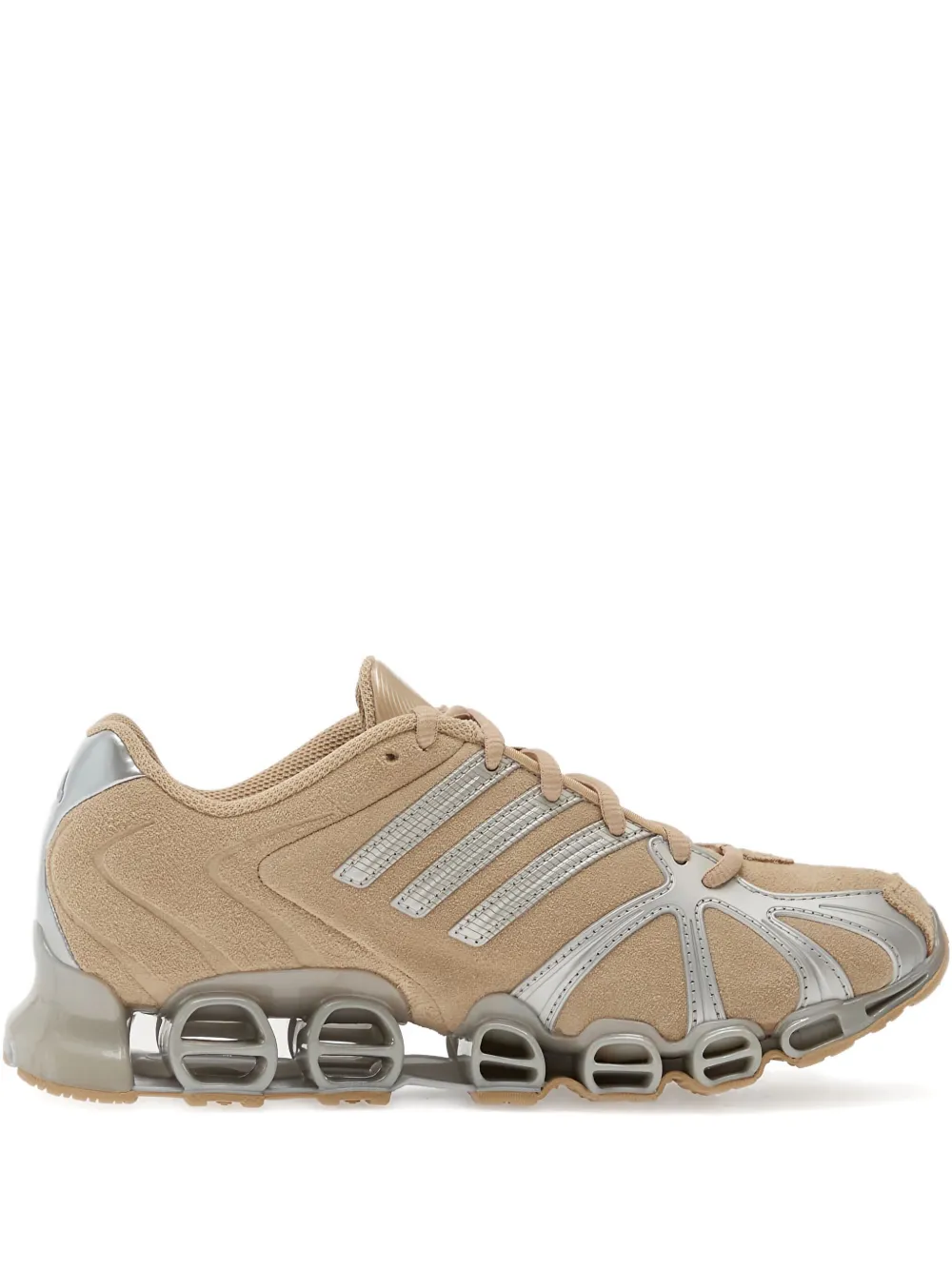 Бежевые фирменные три полоски, панельный дизайн, замша, шнуровка, серебристые детали, массивная резиновая подошва, нашивка с логотипом на язычке