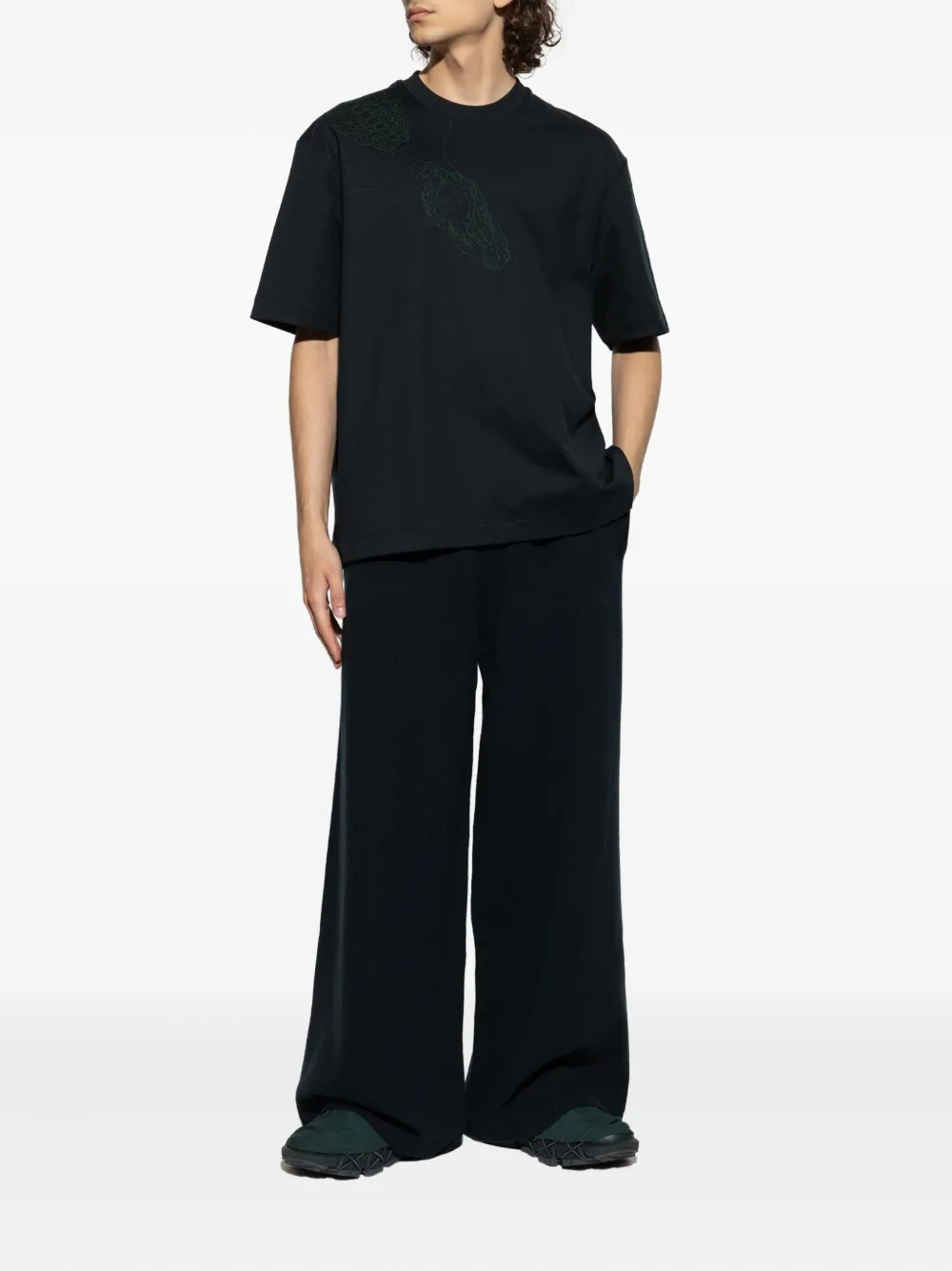 Темно-зеленая футболка с вышивкой, круглым вырезом и короткими рукавами