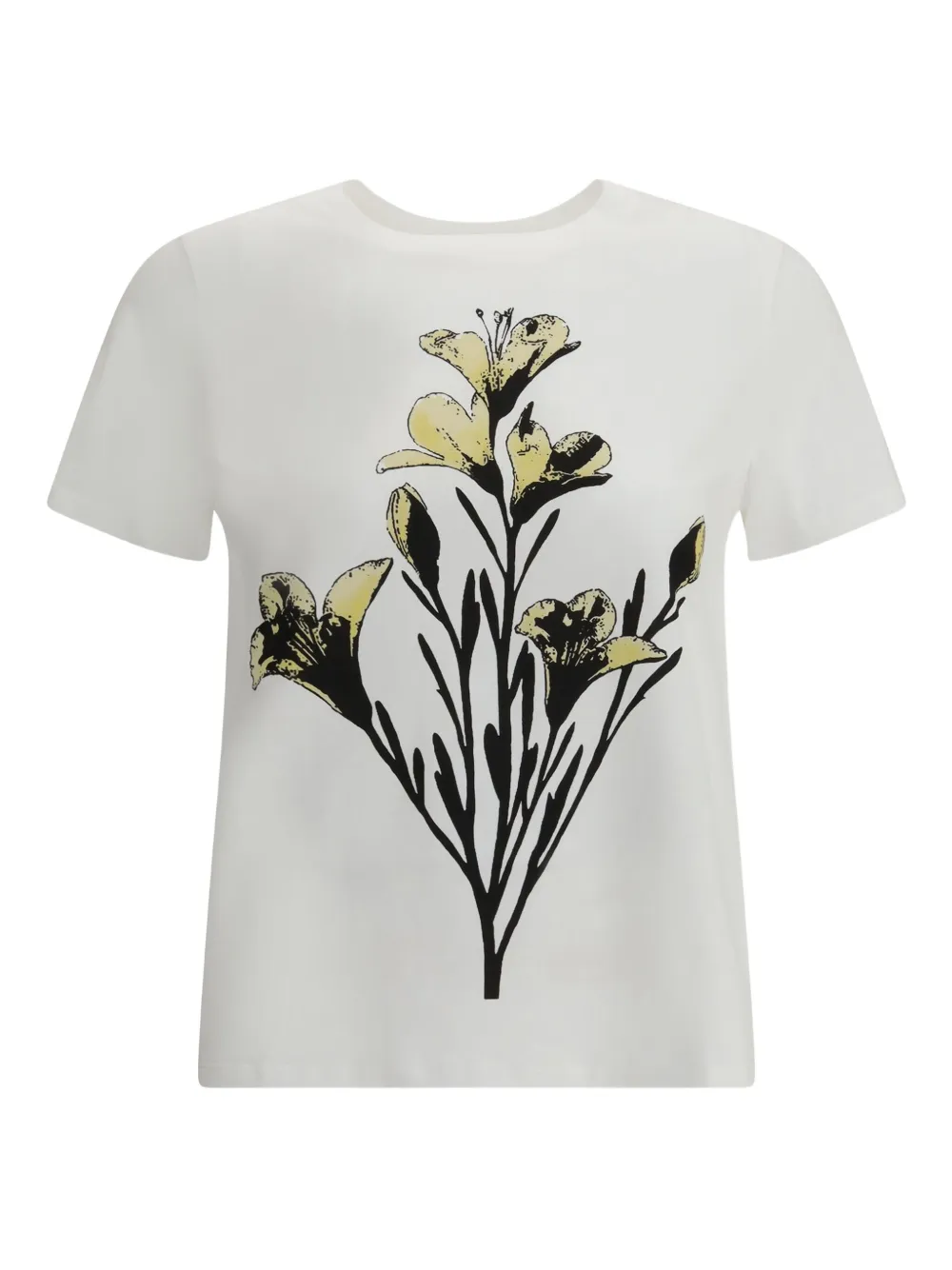 Белая футболка с цветочным принтом, круглым вырезом и короткими рукавами