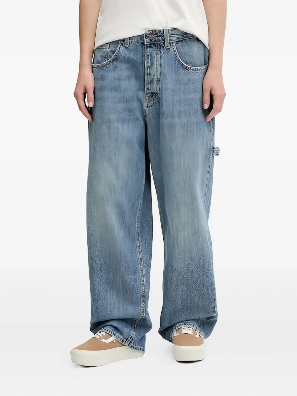 Джинсово-синий, патч с логотипом сзади, пять карманов, застежка на пуговицы