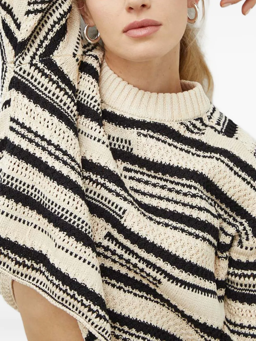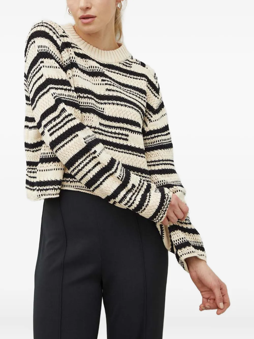 Бежевый и черный полосатый узор, круглый вырез, длинные рукава, рубчатый низ