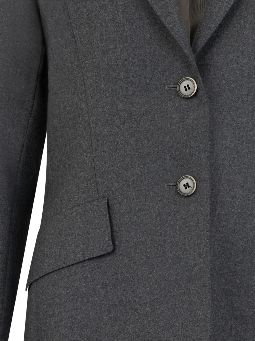 Серый цвет, клапаны на карманах, лацканы с вырезом, застежка на одну пуговицу