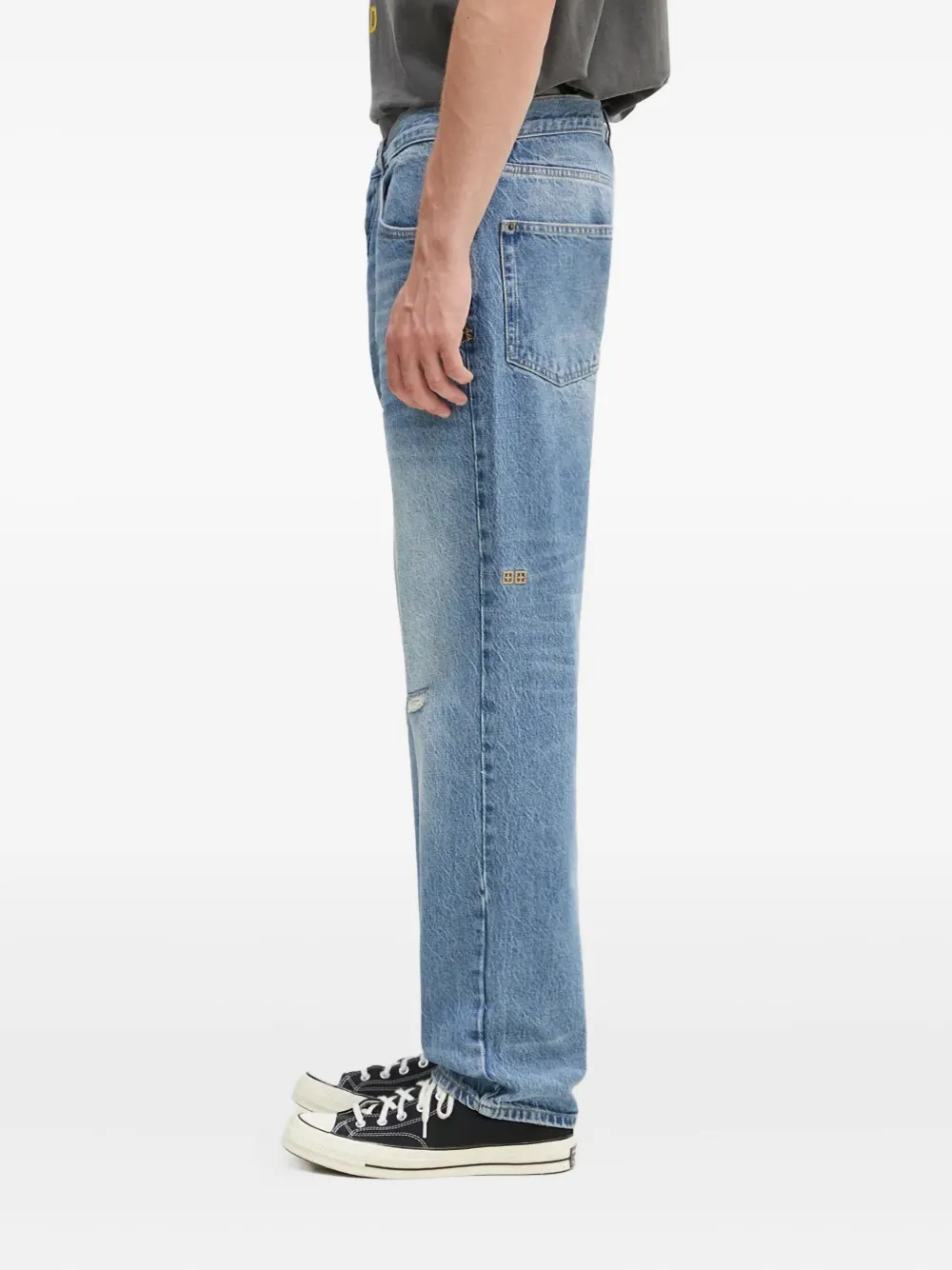 Синий деним с потертостями, пять карманов, шлевки для ремня, застежка на пуговицы