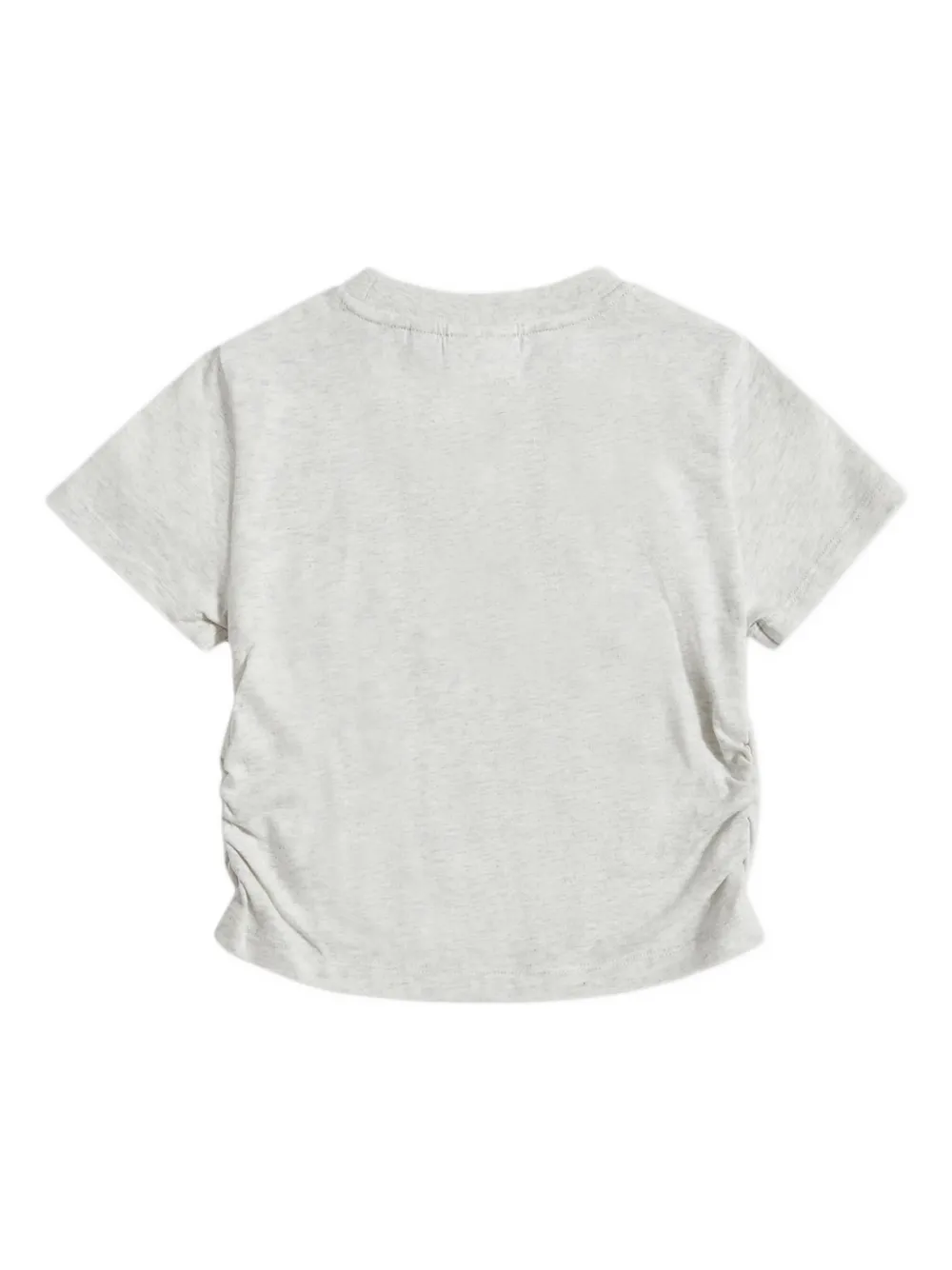 Светло-серый хлопок короткие рукава сборки по бокам круглый вырез графический принт