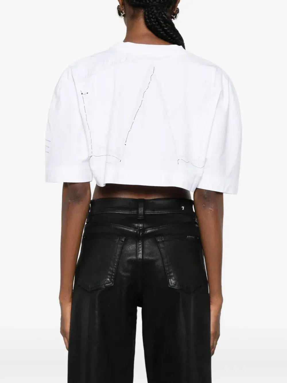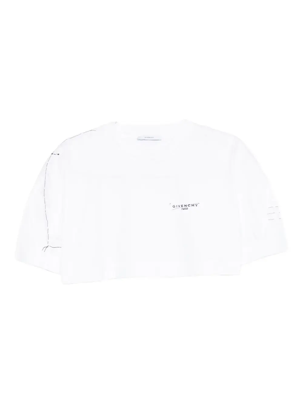 Белый цвет, логотип, круглый вырез, короткие рукава, прямой подол, тональная строчка