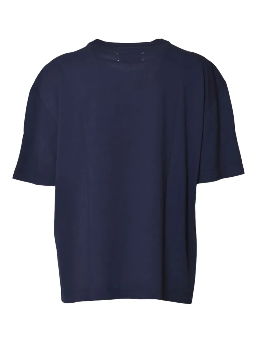 Синий принт, короткие рукава, круглый вырез, фирменная отделка четырьмя стежками сзади