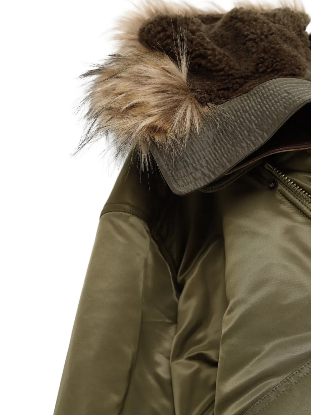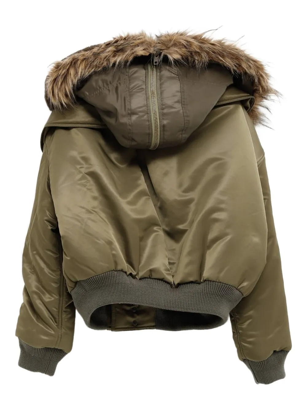 Зеленая отделка из меха, ребристый край, застежка-молния, клапан кармана, ребристые манжеты