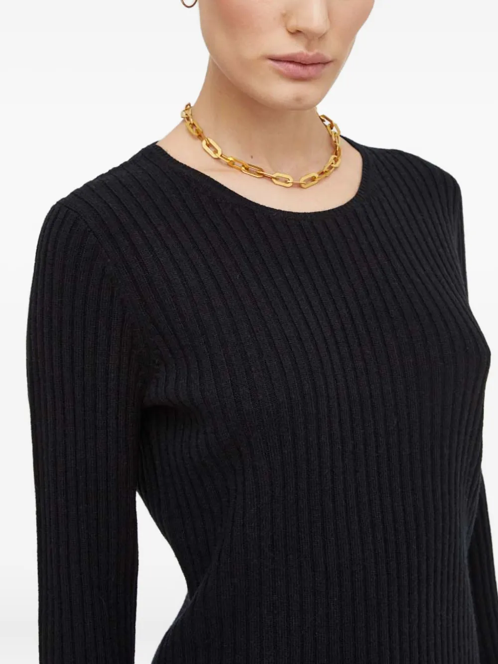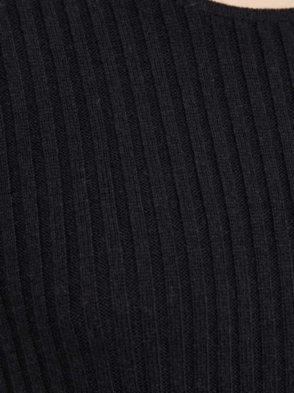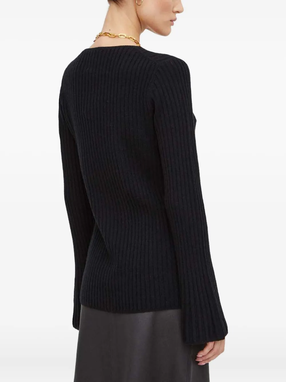 Черный вязаный пуловер в рубчик с круглым вырезом, длинными рукавами и расклешенными рукавами